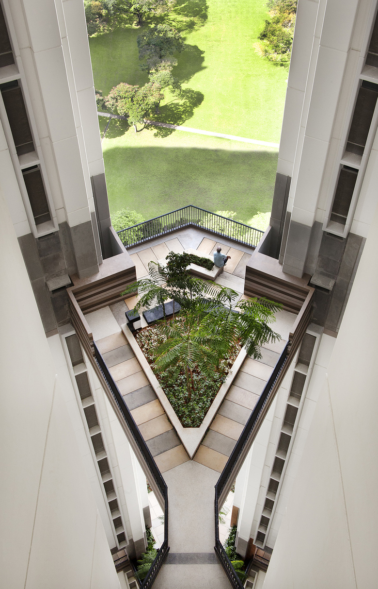 The central innovation is the public, external, shared spaces interwoven through the cluster of towers from the ground to the roof. Each home is part of a Sky Village comprising 80 homes sharing a sheltered community garden terrace. They are designed to foster interaction and be part of daily life. Every resident passes through, or looks over, this space on the way from the lift to apartment and can greet their fellow villagers, see children playing, and residents chatting.