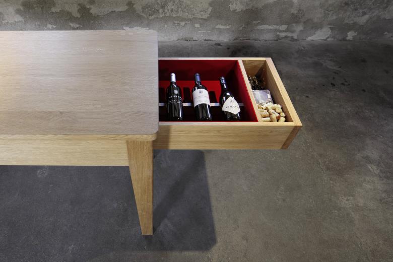 Im Zentrum des offenen Raums steht ein 5 Meter langer, hüfthoher Tisch aus massiver Eiche. Hier trifft sich, wer die hauseigenen Weine verkosten und diskutieren will. Eine grosse Schublade im Tisch funktioniert nach dem Zündholzschachtel-Prinzip. Sie kann jeweils an einer der beiden Stirnseiten herausgezogen werden und enthüllt im richtigen Moment den Schatz der Staatskellerei: je eine Flasche des gesamten Sortiments.