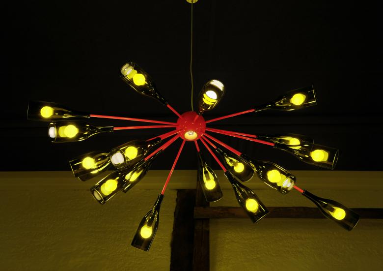 Beleuchtet wird der Tisch von einem imposanten Flaschenluster. Achtzehn explosionsartig angeordnete Ma- gnumflaschen bilden den dynamischen Kronleuchter und strahlen im edlen Licht. Den Hintergrund bilden ein beleuchtetes weisses Regal mit Degustationsgläsern sowie ein gediegener roter Samtvorhang, der die Toiletten geschickt vom restlichen Raum abtrennt.