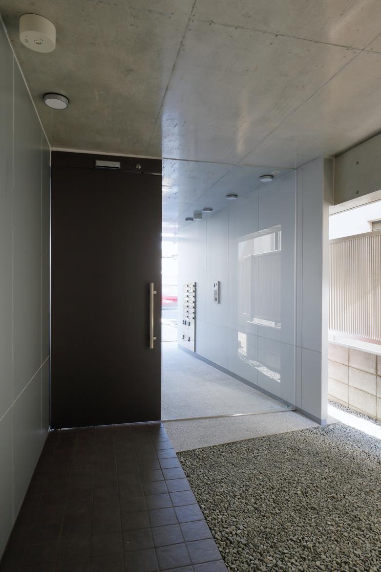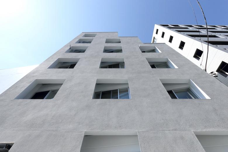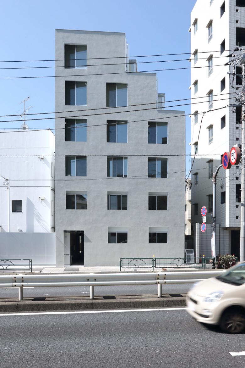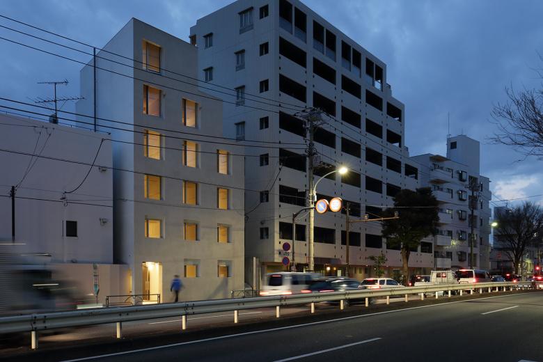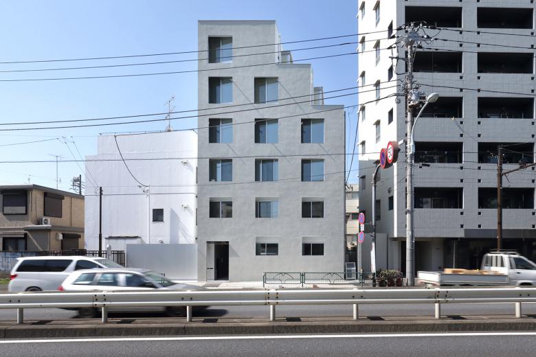 昼夜を問わず車が走り抜ける環七通りに面して建つ集合住宅です。通りから住環境を守ると同時に、街環境にも寄与する建築を考えました。