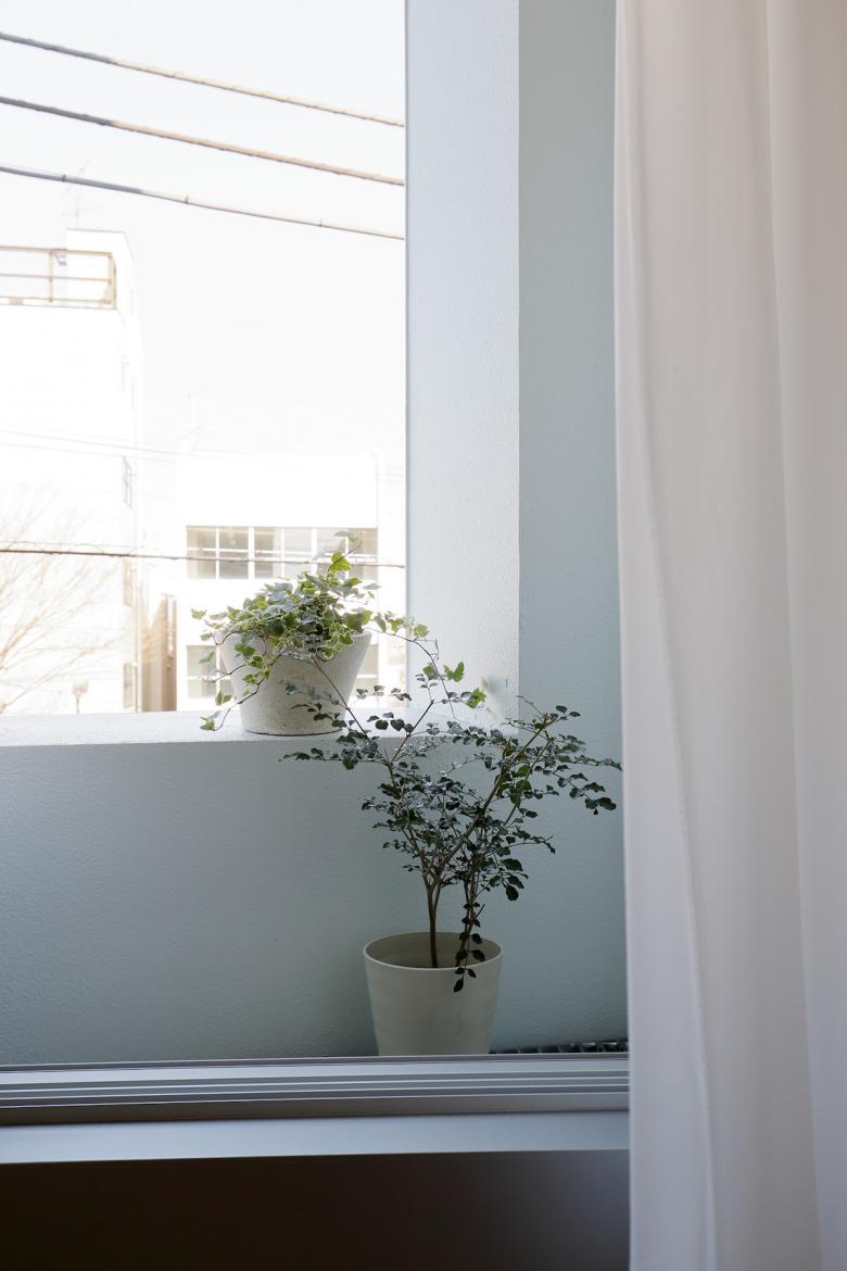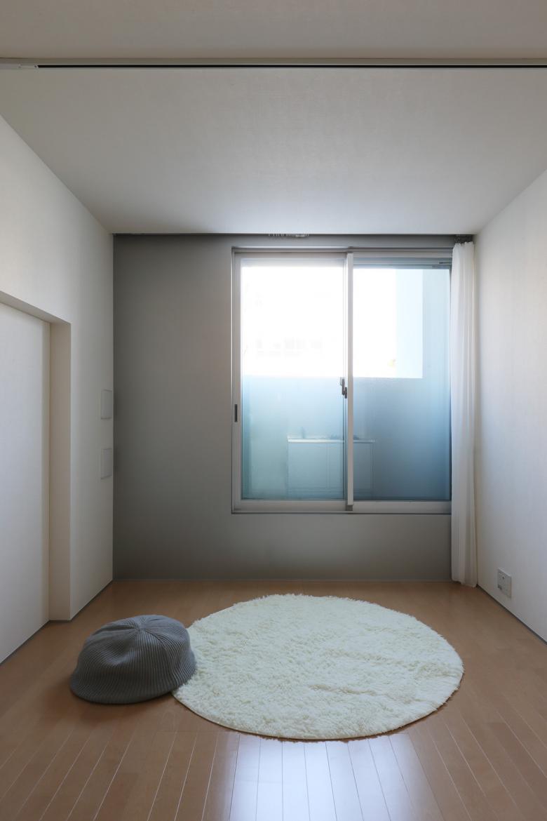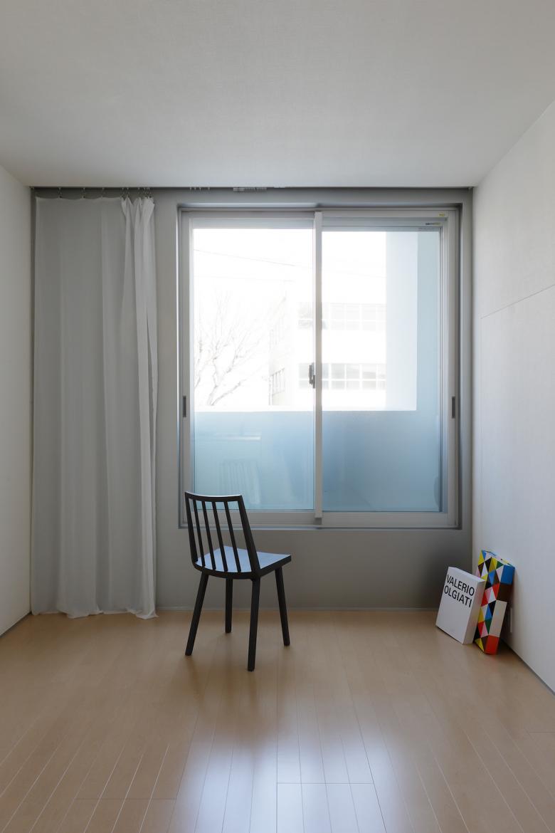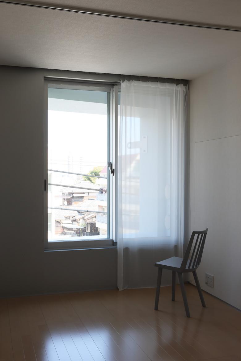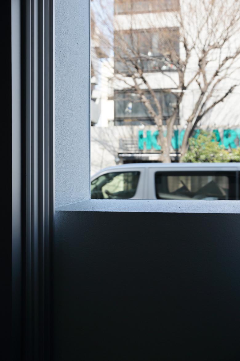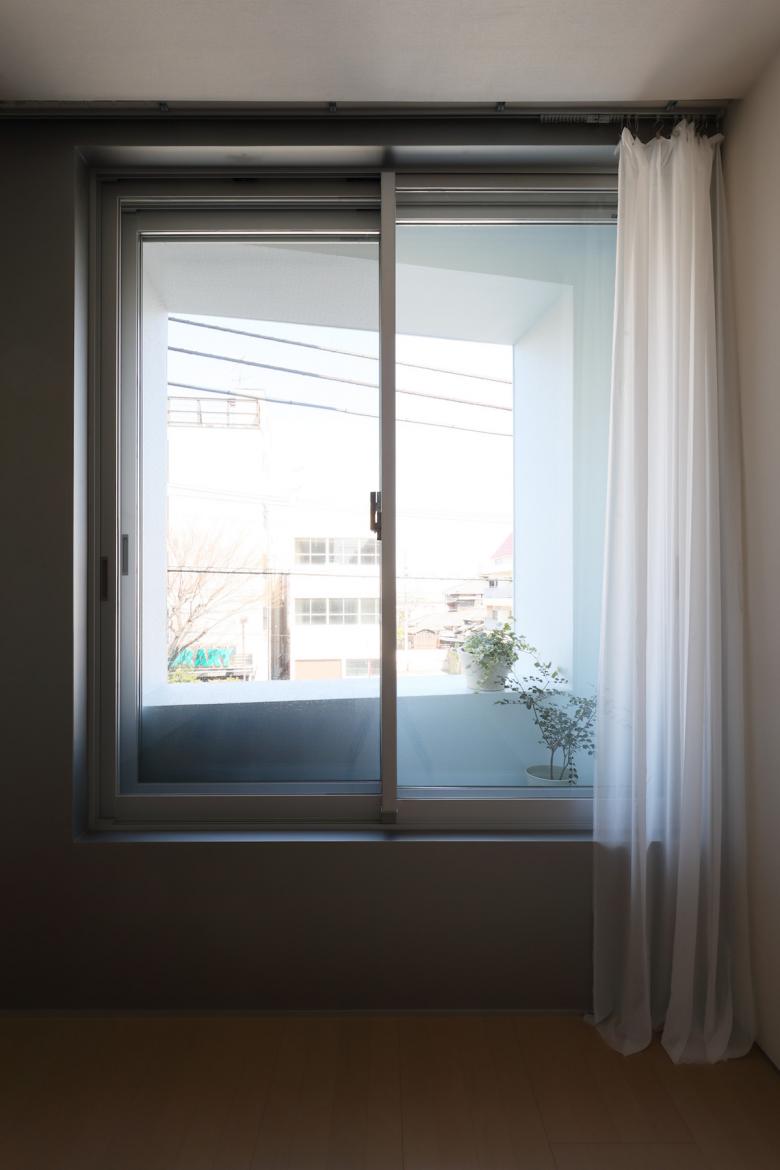 敷地なりに雁行する住戸の外壁の外に、大きな壁をもう一枚立てます。住戸の窓と外側の大きな壁に開けた孔がずれることで、道路を走る車の背を視覚的に遮断し、住環境を守ります。