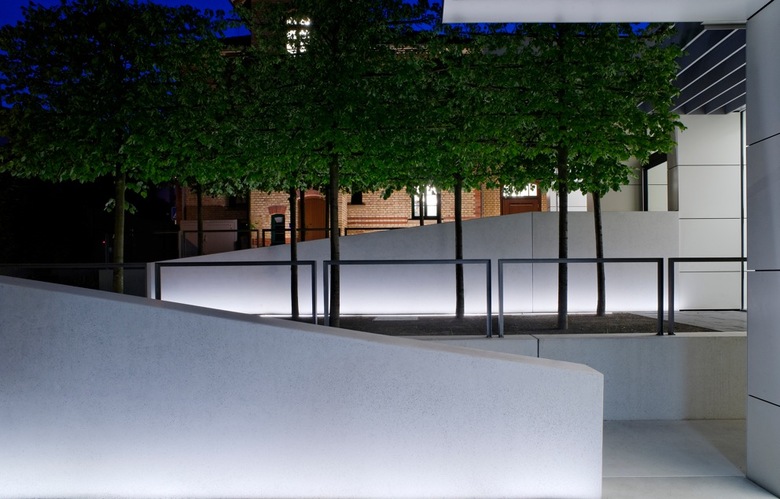 Die Aussenanlagen sind in drei Ebenen strukturiert und führen als visuelle Verlängerung den Innenraum nach Aussen fort. Die architektonische Komposition wird dabei durch lineare LED-Uplights im Bereich der trennenden Betonscheiben und der Vegetation sowie durch eine weiche Fassadenflutung der „Alten Wache“ verstärkt. Fein abgestimmte Beleuchtungsniveaus, sowohl auf den horizontalen wie den vertikalen Flächen, unterstützen die Architektur und schaffen eine angenehme Atmosphäre.