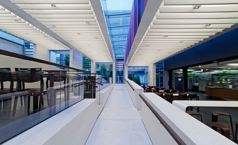 Auf einer Seite der Oberlichter verstärkt ein farbenreiches Kunstwerk das architektonische Konzept. Ein lineares LED-Profil auf der gegenüberliegenden Seite beleuchtet diese Farbfläche, um dessen Wirkung zu steigern, zur Blauen Stunde und während der Abendstunden. Abgesehen von der unmittelbaren Wirkung erzeugt die Reflexion des beleuchteten Kunstwerkes einen dezenten angenehmen Farbverlauf auf den hellen Architekturflächen, der, abhängig vom eigenen Blickwinkel, variiert.