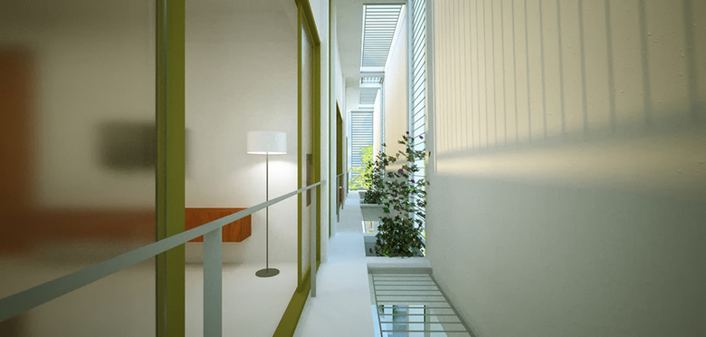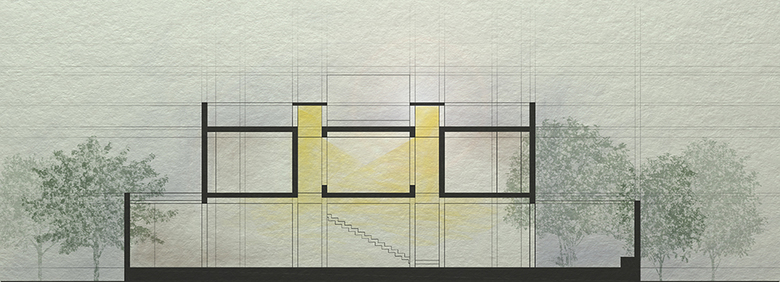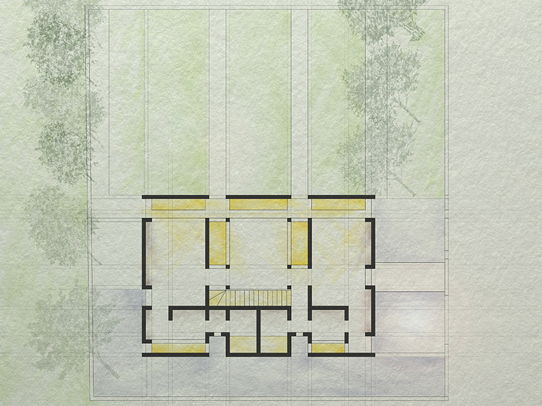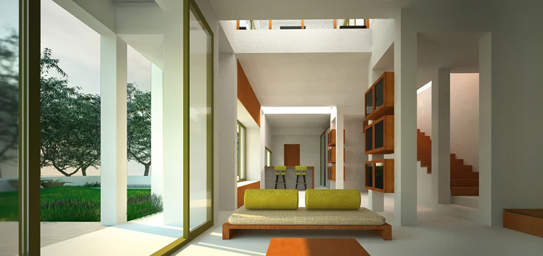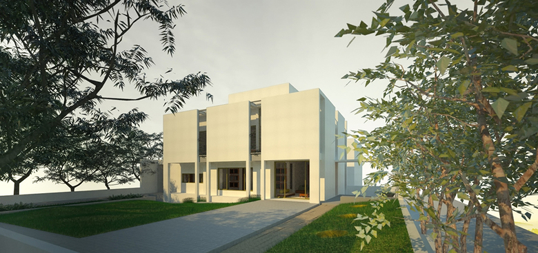 A clear brief of accommodating all the activities in less than half of the land and the rest to be left for the greens placed the focus on the line that stitches the built and the nature. This line is enlarged into a zone of void by conceiving a shell and a core. The shell is more porous on ground, revealing the core that turns into a veranda. The life is lived through the day here overlooking the greens that change its colours as the sun moves. The shell on upper floor is made of opaque walls hiding the private quarters of the core. This reflects the sunlight, frames the views, and harbours the vegetation that cast ever changing shadows as the earth rotates. The zone of void also helps in expanding the space of small quarters on upper floor and dividing the activities in large hallway on the lower.
