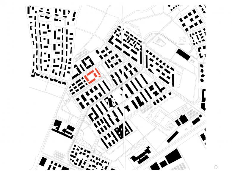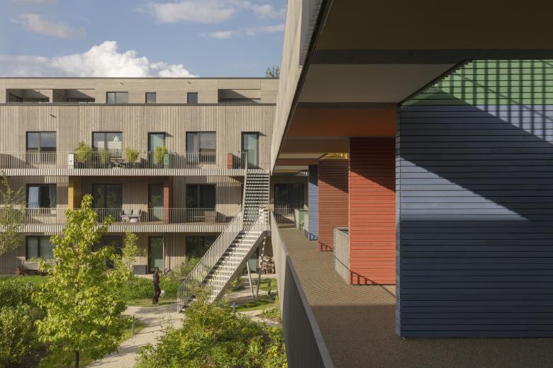 Der Entwurf folgt dem Grundgedanken einer umfassenden Zielgruppenvielfalt bei sozialer Durchmischung. Vier Neubauten mit diversen Wohntypologien, von Clusterwohnungen über klassisches Familienwohnen bis hin zum kleinen Apartment, gruppieren sich um einen gemeinsamen Innenhof. Ihre Erschließung erfolgt über stützenfreie und mit etwas Abstand vor der Außenwand angehängte Laubengänge, die auf breiten Terrassen eine Aneignung durch die Bewohner und spontane Begegnungen im Alltag ermöglichen. Die Farbgebung der Untersichten und Schotten akzentuiert diese besonderen Räume zusätzlich.