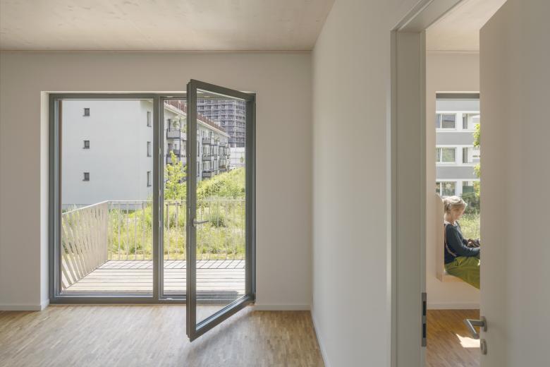 Die Neubauten sind in Holzrahmenkonstruktion mit Holz-Beton-Verbunddecken erstellt. Zusätzlich wurde ein Bestandsgebäude an der Nordostseite des Grundstücks saniert und durch eine zweigeschossige Aufstockung in Holzbauweise erweitert. Das Achsraster der Holzrahmenkonstruktion bildet eine konstruktive Grundlage, die auf einfache Weise eine hohe Grundrissvariabilität ermöglicht. Jeder Wohnungstyp wurde in zwei verschiedenen Größen angelegt, so dass Grundrisse mit Nord-Süd-Ausrichtung durch ihre geringere Tiefe das Tageslicht besser ausnutzen. Insgesamt wurde eine Vielfalt von Wohnungsgrößen wirtschaftlich umgesetzt, die mit den Flächenanforderungen unterschiedlicher Wohn- und Lebensbedürfnisse korrespondiert und Anpassungsmöglichkeiten für die Zukunft bietet.