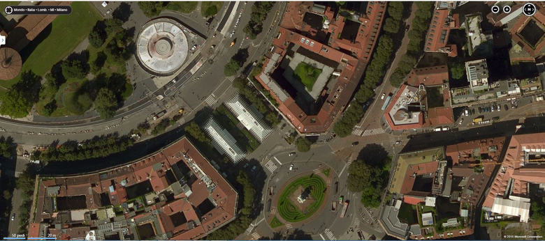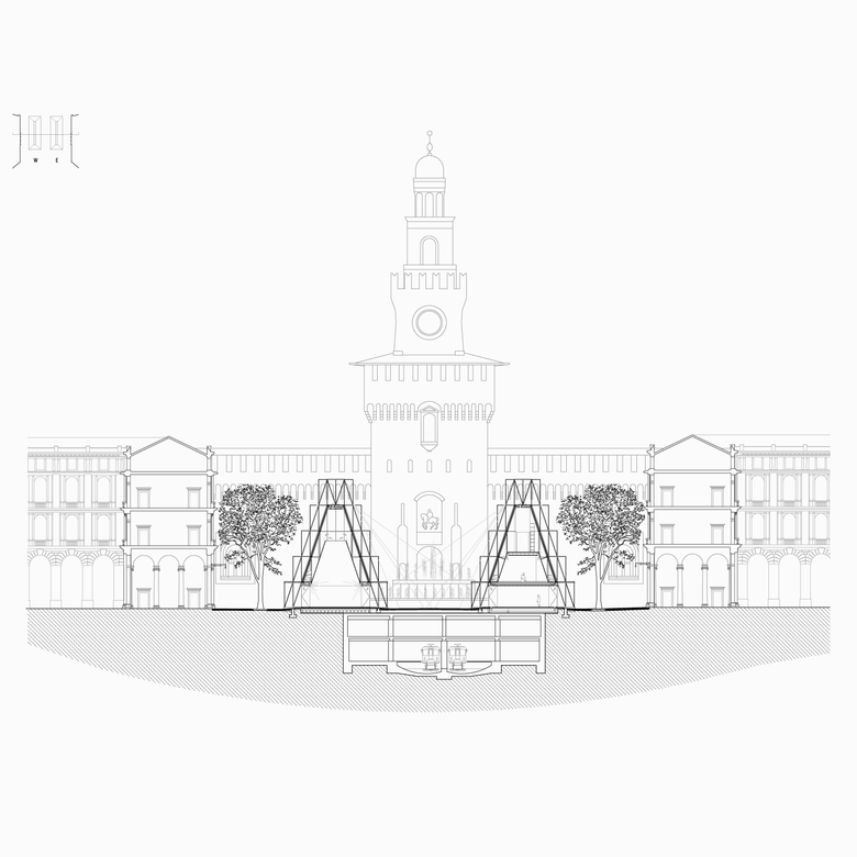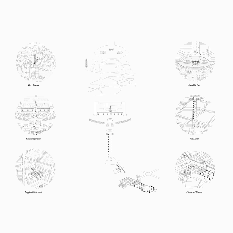 L’opera vuole confermare quel sistema assiale di spazi pubblici che dal Duomo, attraverso la Loggia dei Mercanti e il palazzo della Ragione e poi lungo via Dante, porta sino all’Arco della Pace sulla traiettoria della statale del Sempione.