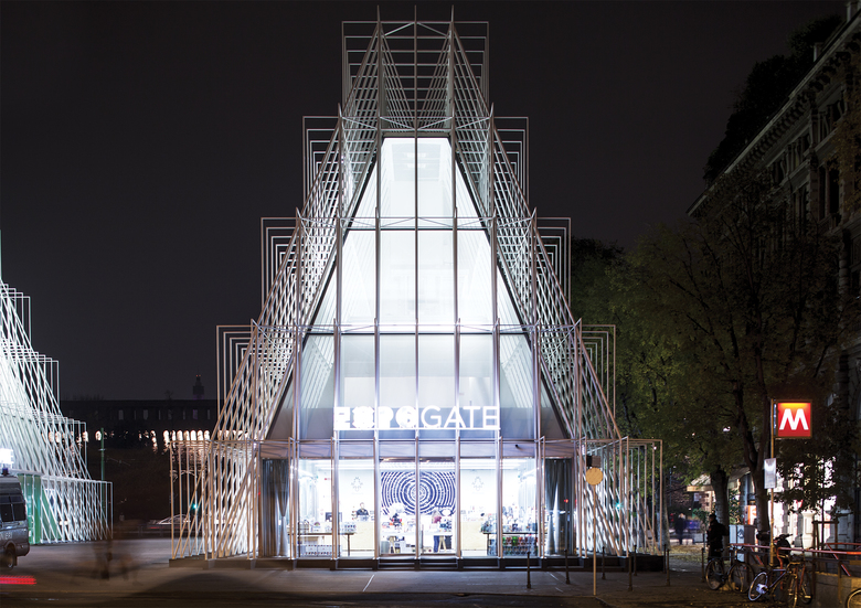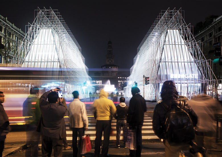 Expo Gate è un grande dispositivo complesso ottenuto per sommatoria di elementi semplici. L’opera è realizzata secondo principi di leggerezza,