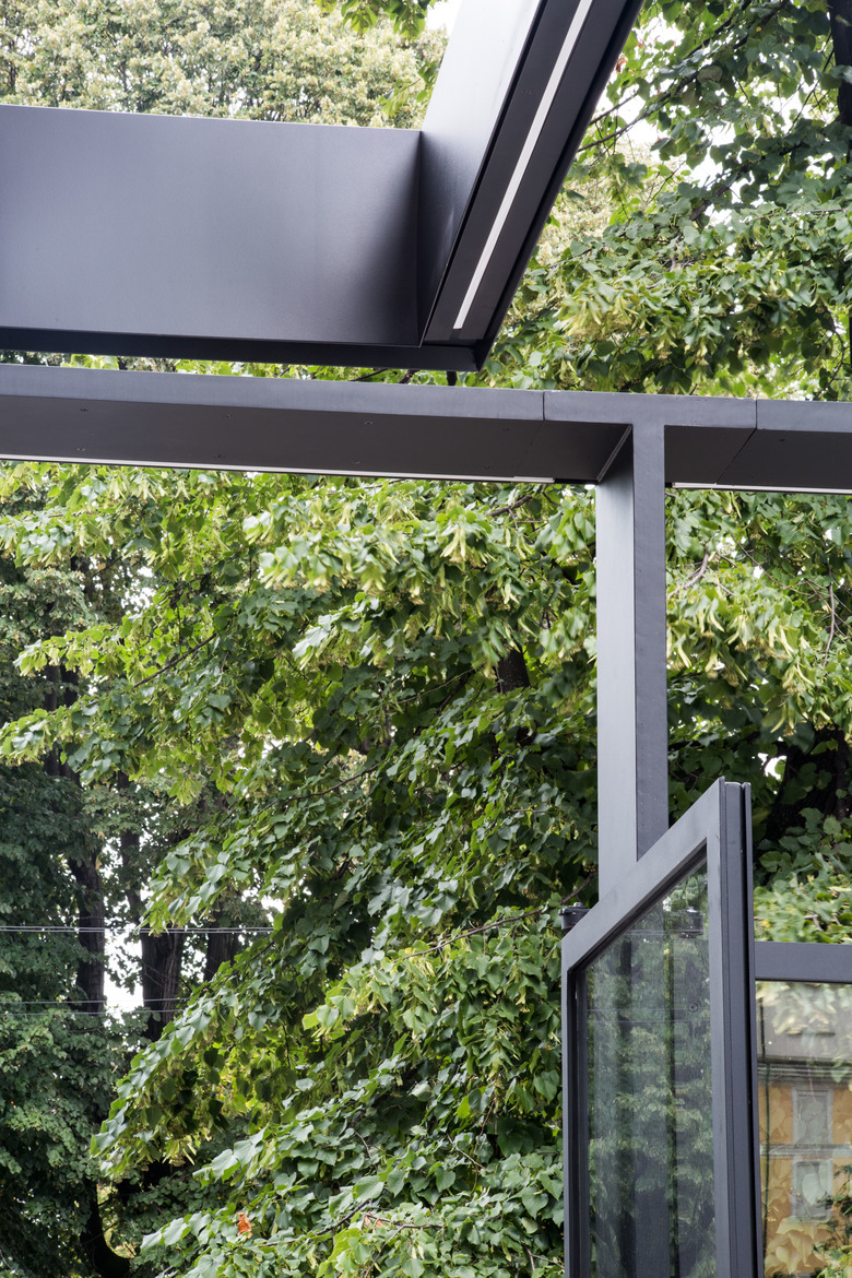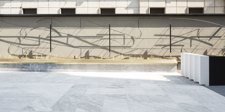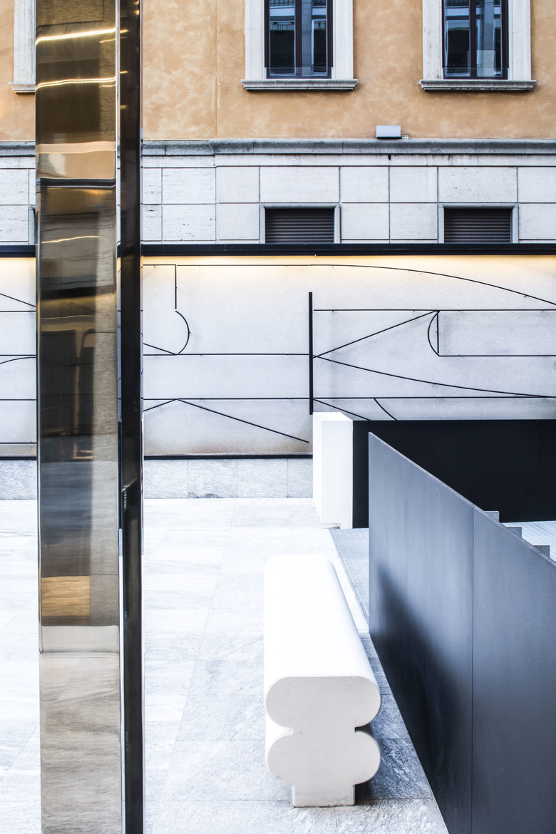 Questo spazio verde è preceduto all’ingresso da una piazzetta metafisica, omaggio agli artisti della storica galleria milanese Il Milione. Il decoro metallico a parete, la seduta e il parapetto bianchi, gli elementi trilitici illuminanti e decorativi, diventano segni d’arte nella città e negli spazi privati, che catturano lo sguardo dei passanti.