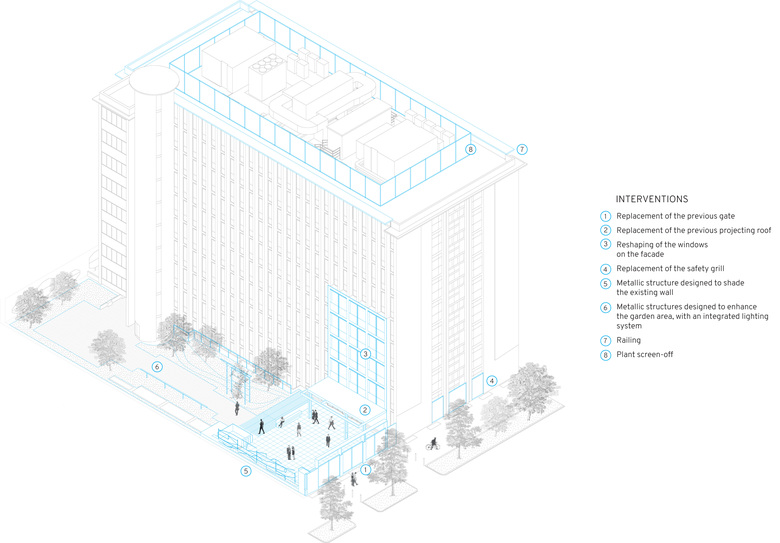 L’edificio torna alla città, i segni che lo compongono si mescolano a quelli della strada, si mescolano in un una nuova urbanità.
