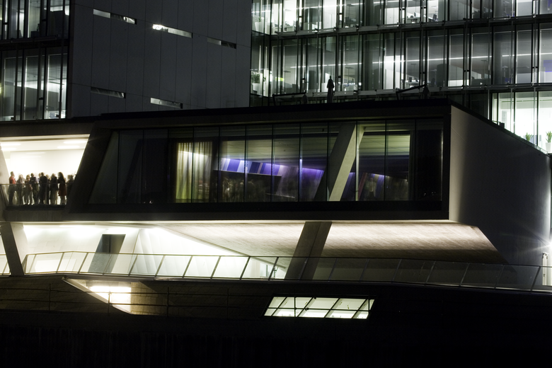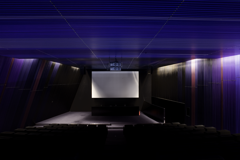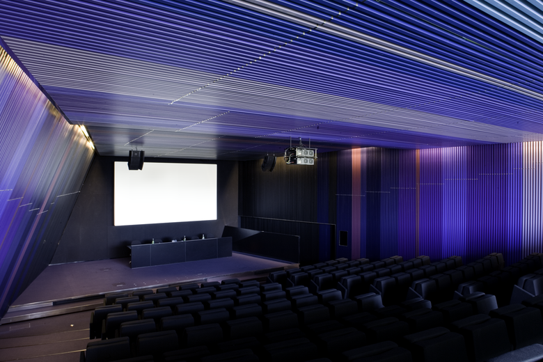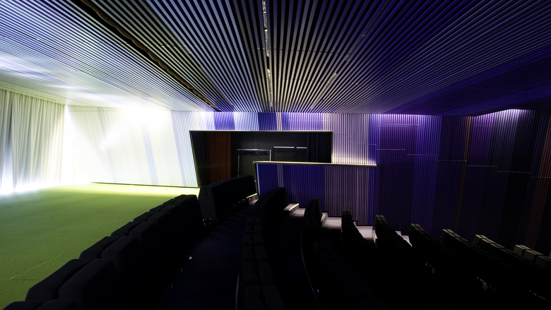 Il piccolo edificio è l’unione di un auditorium e di una particolare sala riunioni.