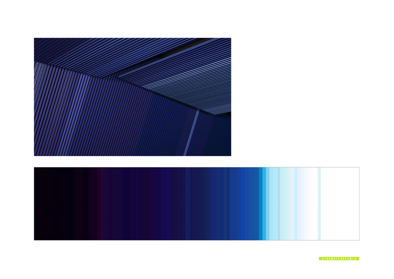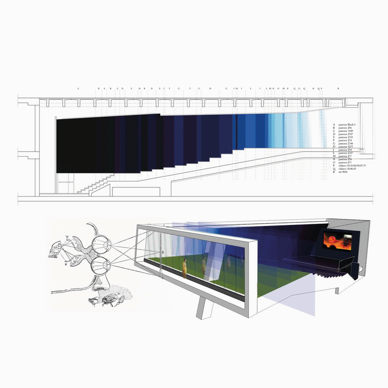 Il lato lungo della sala lascia entrare la luce naturale, il lato corto è il luogo delle proiezioni, delle immagini digitali. Una serie di quadri prospettici, superfici ottiche e diaframmi tagliano la luce che si deposita e si trasforma in immagine. Le pareti e il soffitto della sala riproducono una dissolvenza dalla luce bianca al nero del buio come in una distorsione e forzatura prospettica della luce, l’iper atto di vedere con l’iper atto di non vedere mescolati.