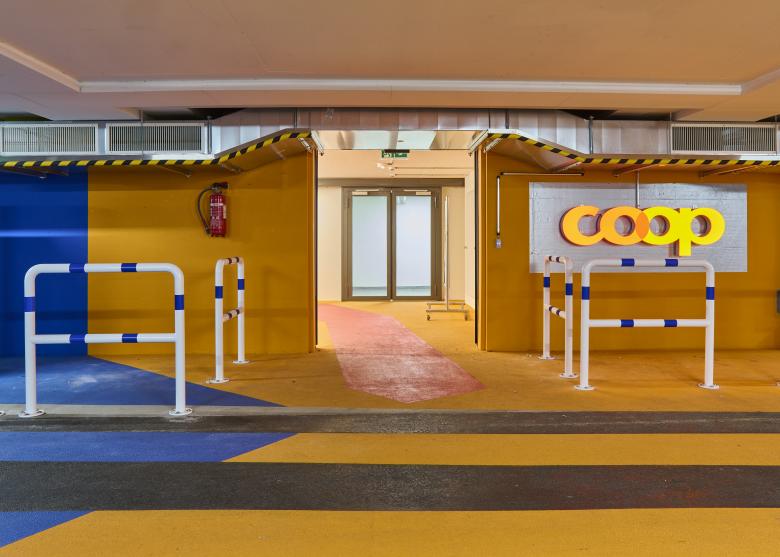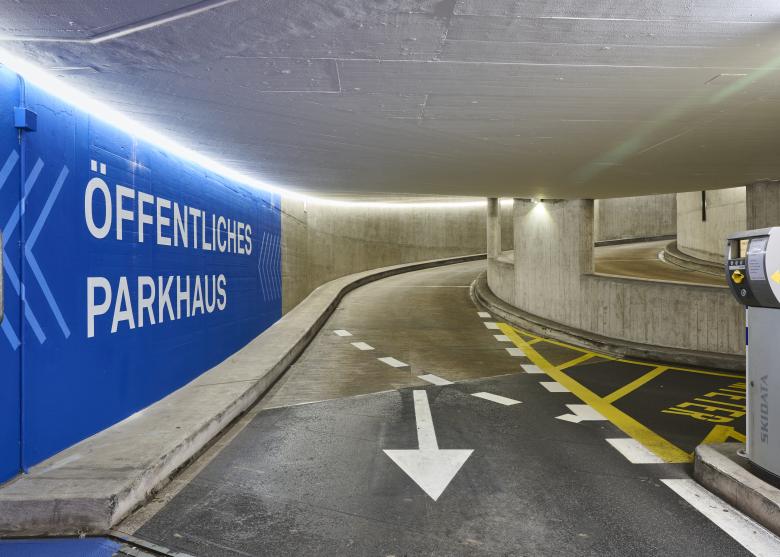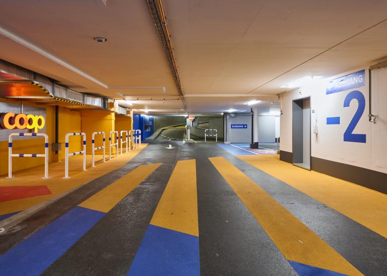 Die mehrgeschossige Parkierungsanlage im Untergeschoss wird saniert und mit einem effizienten Belichtungs- und Farbgebungskonzept attraktiver und kundenfreundlicher gestaltet.