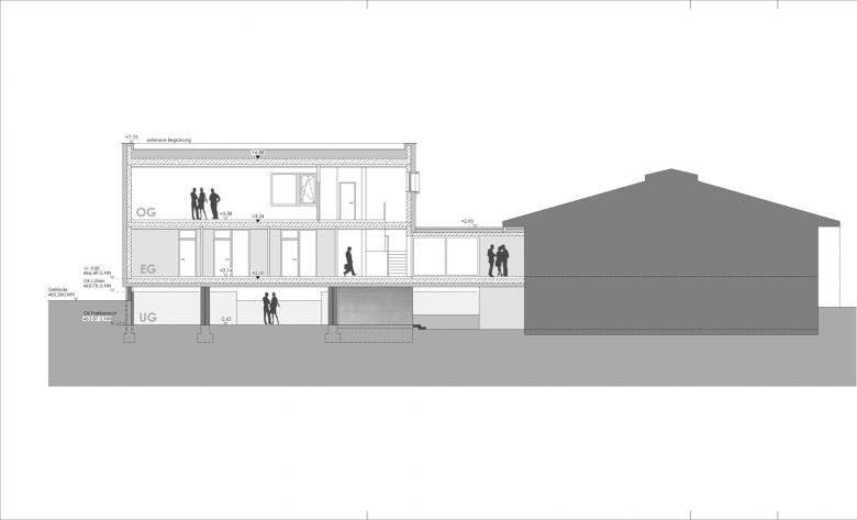 Unter dem Dach der Augsburger KLAUS-Gruppe versammeln sich vom Bauträger bis zum Fertigteilwerk verschiedenste Firmen, die alle Bereiche rund ums Bauen abdecken. Dazu gehören auch das Tiefbauunternehmen ECKLE GmbH sowie die Firma RECYCLING+ in Langenau, deren Büroflächen mit Hilfe eines kleinen Anbaus erweitert wird. Das neue Gebäude ist unterfahrbar und über einen Gang auf Erdgeschossebene mit dem Altbau verbunden. Es ruht auf 20 Stützen, die die Last abtragen und gleichzeitig die Parkflächen im offenen Untergeschoss strukturieren. Bis Ende 2023 soll der Bau abgeschlossen sein.