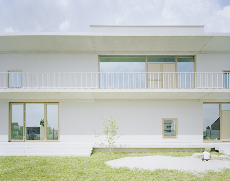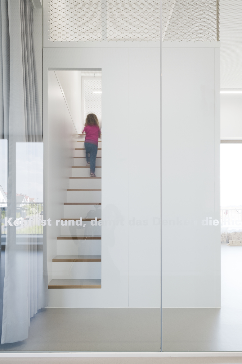 Hinter dem mineralischen Kratzputz verbergen sich 20 Zentimeter Wärmedämmverbundsystem vor einer Ortbetonkonstruktion. Darin befinden sich Räume für drei Kindergartengruppen im Obergeschoss und zwei Krippengruppen im Erdgeschoss. Rückzugsräume und verglaste Gemeinschaftsflächen wechseln sich ab, eingebaute Möbel und Fensterbänke können beklettert werden und aufgeklebte Sinnsprüche an den Scheiben sollen Beulen an den Köpfen vorbeugen.