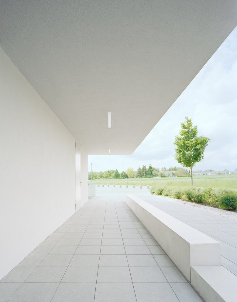 Ein klar gegliederter, hellgrauer Baukörper – der neue Kindergarten in Aichtal bei Stuttgart lässt sich durch seine monochrome Farbgebung ganz auf die Reize der umgebenden Landschaft ein.