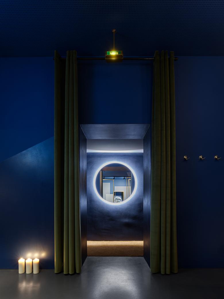 Über drei Stufen und eine dem Häuschen gleich gefärbte Holztür betritt der Gast einen etwa zwei Quadratmeter großen Vorraum. Seine einzige Lichtquelle erscheint hinter einem runden, für den kleinen Raum ungewöhnlich dimensionierten Spiegel. Ein Vorhang aus tiefgrünem Samt markiert spürbar eine weitere Schwelle.
