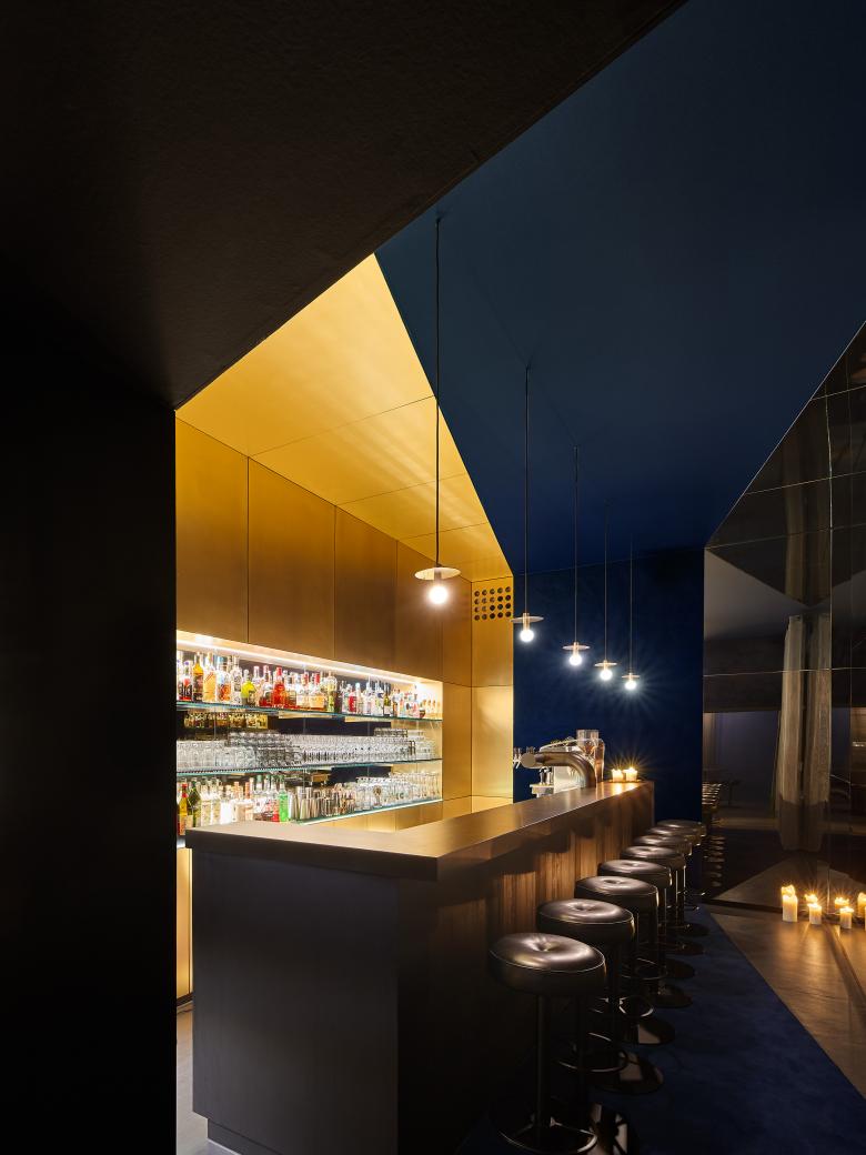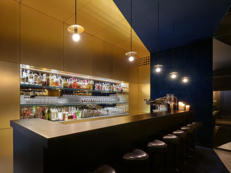 Der Barbereich hebt sich durch seine dunklere Farbgebung deutlich von der sich in Endlosigkeit verlierenden Welt aus farbigen Flächen ab. Ein am Boden beginnender Teppich lässt den Gast mehr haptisch denn visuell den Zugang zunächst erfühlen - er lädt in eine weiche und gedämpfte Welt ein - setzt sich an der Wand fort und ergibt sich in einer akustisch wirksamen Spanndecke. Das stark gedimmte Licht setzt den Fokus genügsam auf die Gesichter der Gäste – die Wärme und Struktur des tief schwarz lackierten Holzes der Theke bleibt mehr spürbar denn sichtbar – der Blick des Gastes wird auf die mit echtem Messing bekleidete und teilweise verspiegelte Bar gelenkt, welche raumbildend wieder in der ihr gegenüberliegenden Wand aus unterschiedlich getönten, reflektierenden Glasflächen erscheint.