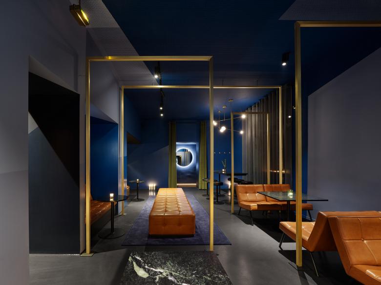 In verschiedensten Nuancen verblassende Blautöne überlagern sich in Flächen, lösen den Raum auf, konterkarieren die Perspektive und spielen mit der Wahrnehmung des Gastes. Messingfarbene Rahmen unterschiedlicher Dimensionen scheinen den Raum dann wieder angenehm zu gliedern. Die Tische aus hochglanzpoliertem schwarz-grünem Marmor treten in den Hintergrund während die homogen in naturbelassenem Leder, vom lokalen Handwerk ausgeführten Sitzelemente einen deutlichen Kontrast bilden. Ihr Arrangement schafft unterschiedlichste Aufenthaltsqualitäten: von intimen Sitznischen und großzügigen Sitzgruppen, bis zu einer offen gestalteten Sitzlandschaft oder einem halbhohen Sitz-Stehtisch als unverbindliche Kommunikationsorte.