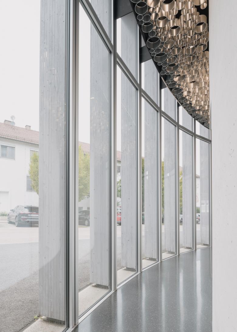 Wirtschaftlichkeit – Die kompakte Anordnung der Funktionsbereiche sowie verschiedene effiziente Bestuhlungsvarianten ermöglichen gleichzeitig die Aufwertung der Bewegungsflächen bei einer geringen Gesamtfläche. Die Reduktion auf wenige unterschiedliche Elemente sowohl im Bereich des Tragwerks als auch der Fassade erlaubt einen hohen Grad an industrieller Vorfertigung in hoher Stückzahl. Die äußeren Holzstützen sind sowohl Konstruktion als auch Teil der Fassade. Der Funktionskern übernimmt die Gebäudeaussteifung. Als thermische Hülle wechseln sich jeweils identische verglaste und geschlossene, gedämmte Elemente in loser Folge ab.