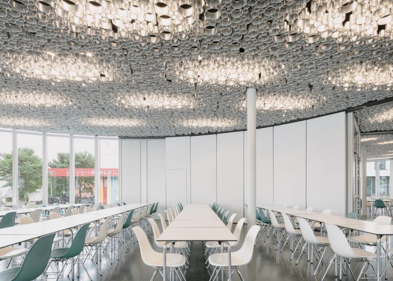 Entwurf – Die offene vertikale Struktur der Konstruktion definiert sowohl Außen- und Innenraum ohne diese voneinander zu trennen. So ergibt sich ein fließender – auch im Inneren lichtdurchfluteter – Raum, der differenzierte wie vielfältige Nutzungszonen ermöglicht. Unterstützt wird die räumliche Verzahnung durch raumhohe Glaselemente sowie die optische Fortsetzung des Bodenbelags. Der dunkle Asphaltbelag des Außenraumes wird im Innenbereich durch einen dunklen Gussasphalt fortgesetzt. Der Sichtbeton des Funktionskerns mit seinem eingebauten Corian Thekenelement ergänzt die reduzierte Materialwahl. Die Abhangdecke aus zusammengesetzten Aluminiumröhren unterschiedlicher Größe ist vom Rand abgesetzt. Die drei kreisförmigen Raumzonen sind an der Decke durch breite schwarze Bänder ablesbar. Die darin laufenden Trennwandelemente ermöglichen eine flexible Raumnutzung. Großzügige Bewegungsflächen bieten neben dem Speise- und Rückzugsbereich zusätzliche Aufenthaltsqualität und vermeiden zusammen mit angemessen dimensionierten Zugängen Engstellen im Bereich der Verkehrsflächen. Sämtliche Nebenräume und die Küche befinden sich konzentriert in einem Rondell. Küche und innenliegende Arbeitsräume werden über Oberlichter natürlich belichtet.