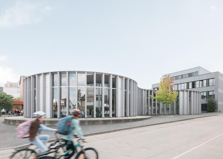 Mehr Platz als Haus Anstatt die heterogene städtebauliche Struktur des Schulzentrums fortzusetzen, versteht sich die neue Mensa als Platz zwischen den Bestandsgebäuden. Am westlichen Platzende befindet sich der Funktionsbereich sowie die Anlieferung, während sich die Speisebereiche zum südlichen und östlichen Teil des Platzes orientieren. Am nordöstlichen Ende erfolgt der Hauptzugang von der Straße. Nach Südosten öffnet sich die Fläche zum Grünbereich zwischen den Schulen.