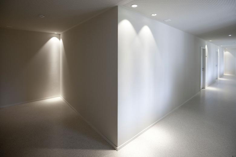 Die Beleuchtung folgt der Intention der Architekten, den Weg der Angehörigen zu den Verstorbenen in den Aufbahrungsräumen still und zurückhaltend zu gestalten und die Räume immer intimer, stiller und feierlicher werden zu lassen. Von der hellen, natürlich belichteten Eingangshalle betritt man den Besuchergang ohne Bezug zur Umgebung. Die Aufbahrungsräume werden durch über dem Katafalk angeordnete Oberlichter natürlich belichtet. Die künstliche Beleuchtung folgt der zurückhaltenden Gestaltung indem sie mit den Einbauten eine Einheit bildet oder die Leuchten für den Betrachter unsichtbar positioniert sind. Das durch die seitlich positionierten Lichtbänder erzielte Seitenlicht stimmt auf die besondere Situation ein. In den Aufbahrungsräumen fällt ein feiner Lichtstrahl aus dem Oberlicht und konzentriert den Blick auf den Verstorbenen.