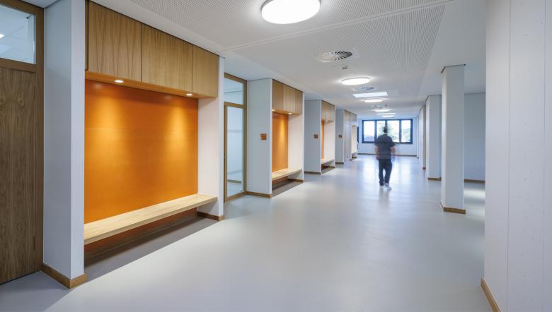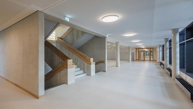 Im Hinblick auf pädagogisch moderne Clusterraumkonzepte, wird die klassische „Flur-Klassen“ Architektur durch ein klar gegliedertes Stützenraster aufgelöst. Durch die Auflösung der massiven Flurwand, wird eine flexible und zukunftsorientierte Grundrissbespielbarkeit möglich. Neben der einfachen Typologie des Klassenraums, stehen hier das inklusionsgerechte Lernen in verschiedenen Lern- und Pausenbereichen im Fokus. Der Flur wird somit nicht mehr nur als Erschließungsweg, sondern als Aufenthalt- und Lernzone wahrgenommen. Vervollständigt wird dieses Prinzip durch ein klares Farbkonzept, welches den Schüler*innen die Orientierung im Gebäude erleichtern und gleichzeitig zu einer angenehmeren Lern- und Arbeitsatmosphäre beitragen soll.