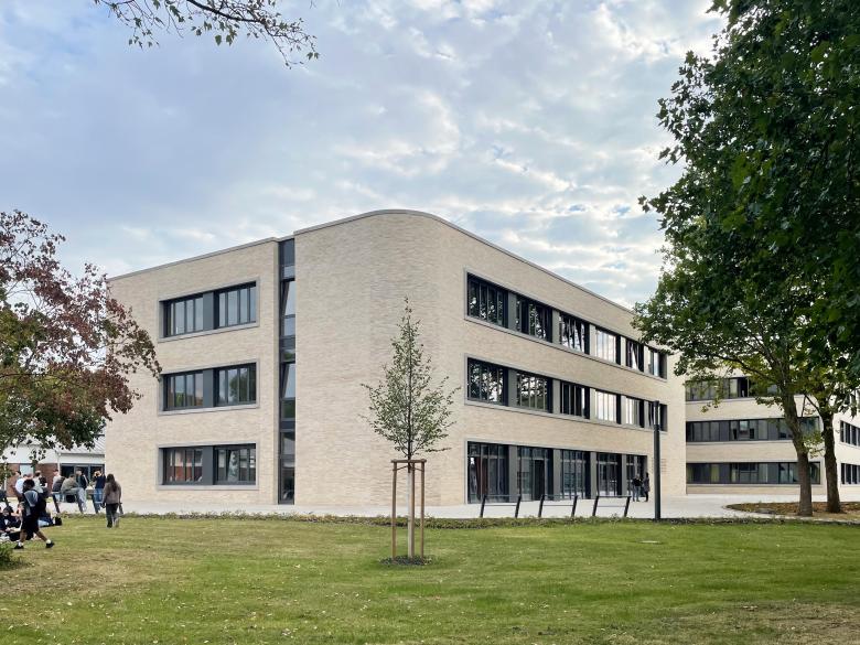 Die Gebäudefigur besteht aus drei klar strukturierten Gebäudeflügeln, die sich um eine zentrale Mitte gruppieren, die neben einem offenen Forumsbereich eine Vielzahl an Aufenthalts- und Selbstlernbereichen für die Schülerinnen und Schüler bietet. Neben der Repräsentationsfähigkeit durch einen offenen, hell gestalteten Eingangsbereich mit angrenzendem Foyer und Veranstaltungsbereich, besticht der Entwurf durch die transparenten und freundlich gestalteten Selbstlernbereiche im Obergeschoss, welche durch eine großzügige Öffnung oberhalb des Foyers, einen direkten Sichtbezug zum Erdgeschoss ermöglicht und den Schüler*innen so ein optimales Lern- und Erholungsumfeld bieten.