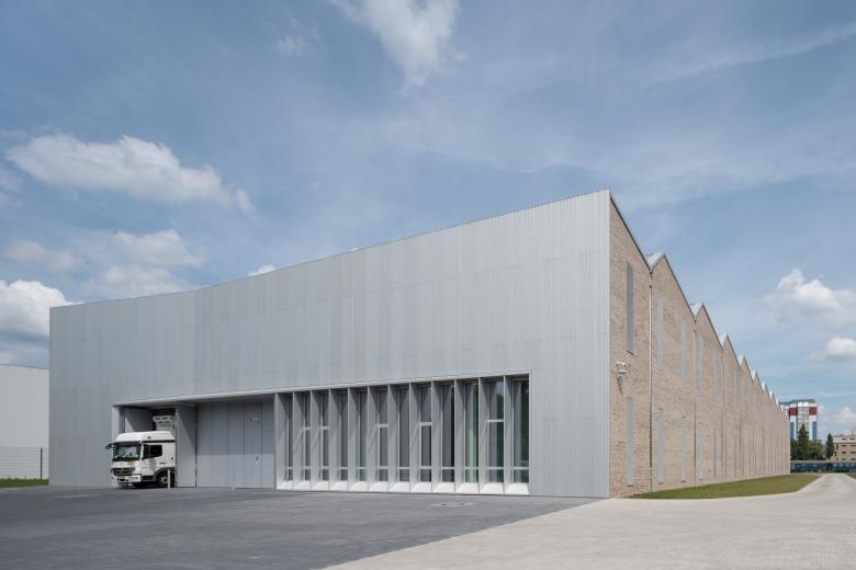Städtebaulich reiht sich der langgestreckte Zweckbau auf dem ehemaligen Gelände des Ausbesserungswerks der Reichsbahn in die Struktur der angrenzenden Gewerbebauten ein. Asymmetrische Giebeldächer und schmale Entrauchungspaneele rhythmisieren die Ziegelfassade des Depots und geben ihm eine einprägsame Gestalt. Zur Straße hin wechselt die Fassade in eine helle, vertikal strukturierte Metallverkleidung mit einem Rahmenelement im Erdgeschoss, hinter dem sich Eingangs- und Anlieferungsbereich und Arbeitsräume befinden. Fassadenschwerter greifen die vertikale Faltung der Stirnfassade auf und führen die Gestaltungselemente der Fassade zu einem Gesamtbild zusammen. Der am Passivhausstandard orientierte Betonskelettbau ist auf einen minimierten Energie- und Wartungsaufwand ausgelegt. Massive Decken und je nach Bereich 30 - 50 cm dicke Kalksandsteinausfachungen stellen ein stabiles Temperatur- und Feuchtigkeitsniveau sicher.