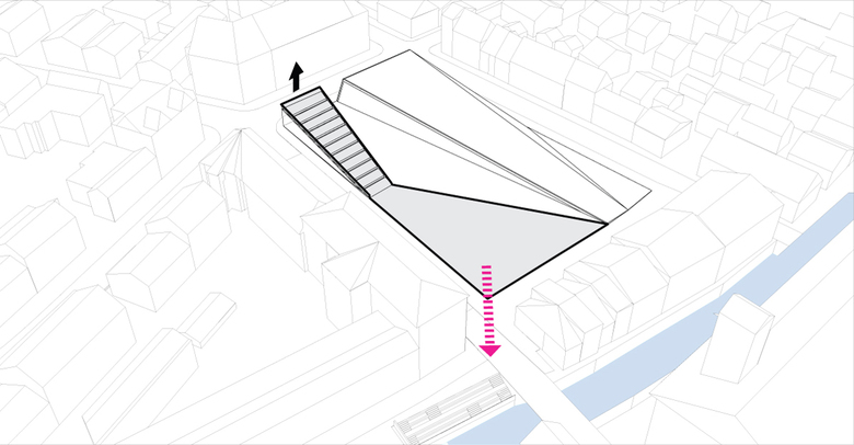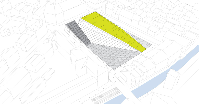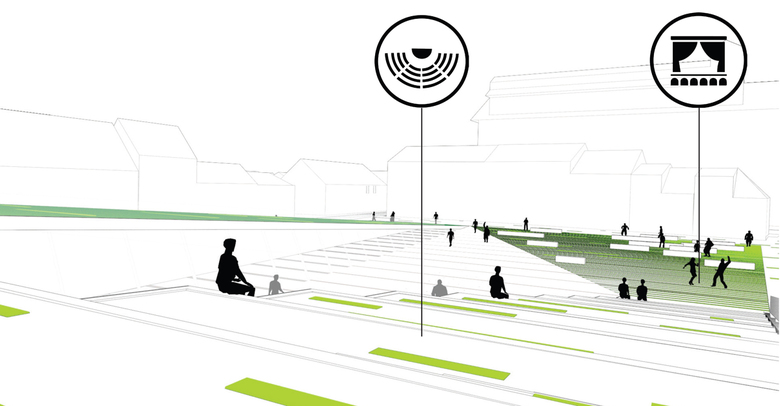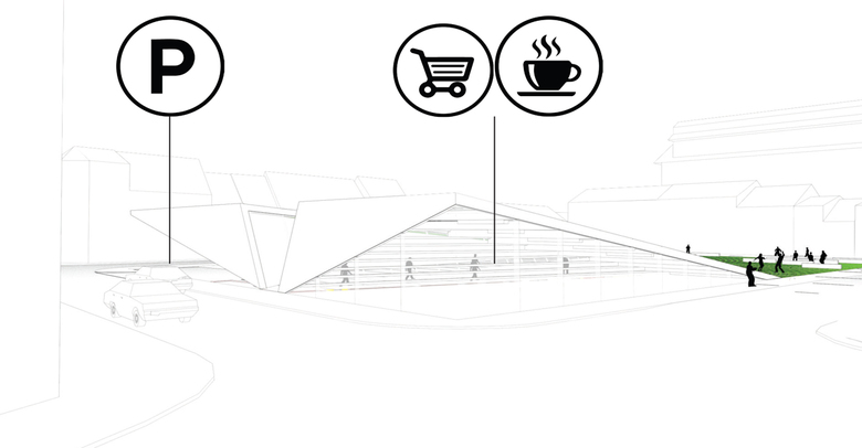 Das Dach der Tiefgaragenrampe wird als öffentlicher Raum und Sonnenwiese genutzt, was eine Kostenersparnis bedeutet, da die Tragstruktur für beide Nutzungen gleichzeitig dienen. In ähnlicher Weise führt die gleichzeitige Nutzung des Café-Daches als Sitzterrasse zu einer wirtschaftlichen Nutzung der Ressourcen.