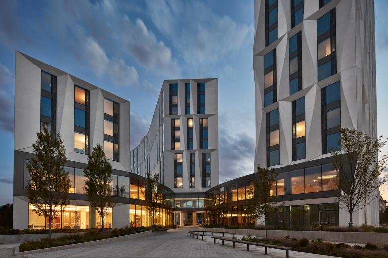 This dynamic mix of new residences, dining, retail, amenities, and outdoor spaces extends the University’s footprint to the north. The location allows the design to create a new “front door” for the University with an open and welcoming ambiance, strengthening pedestrian connections between campus and the greater Hyde Park neighborhood. With its careful assemblage of four slender bar buildings, the project integrates students and community within an urban fabric of plazas, gardens, walkways, and courtyards that offer distinct, human-scaled outdoor environments. And while the buildings are oriented to optimize energy performance by maximizing daylight and natural ventilation, they simultaneously create the kind of sunlit urban landscape and lively social vibe that students want.