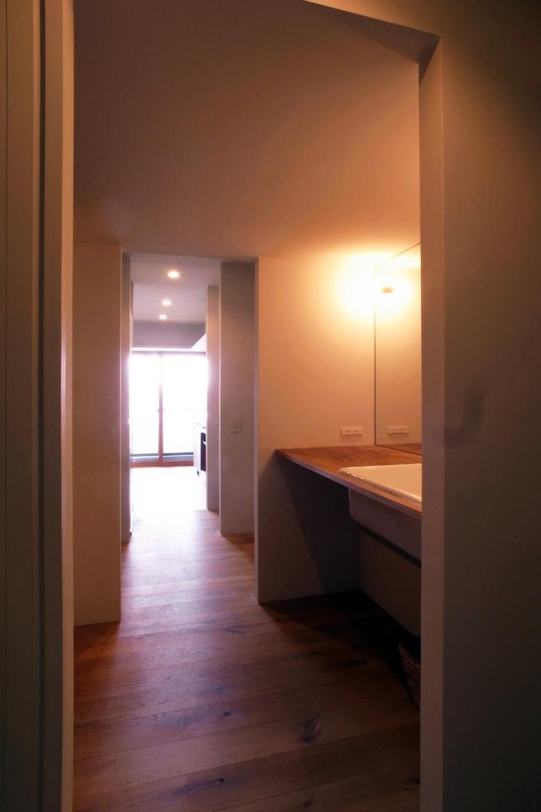 具体的には、玄関の風除区画を変更し、いくつかの建具を外すことで、いままでは見えていなかった18mの奥行きを露にし、見通しをつくり、