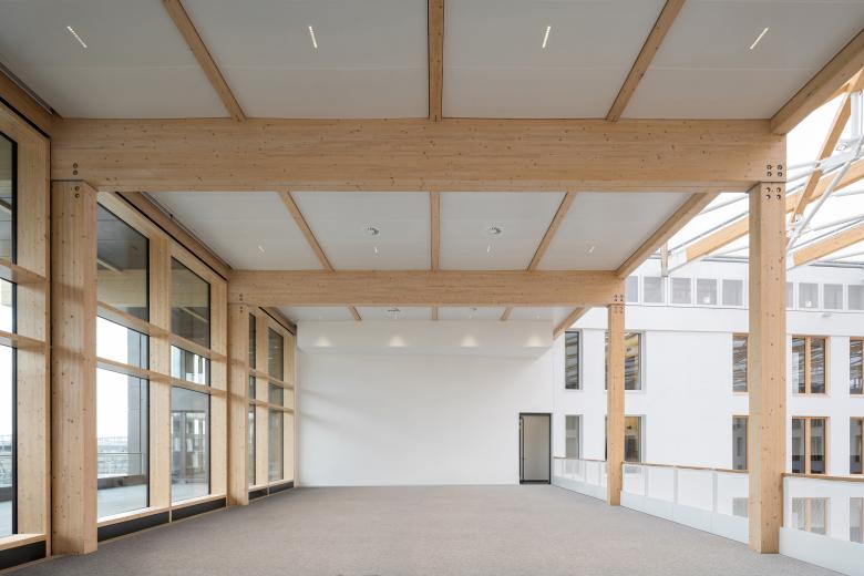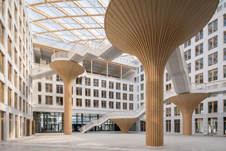 Im Herzen des Carré-Gebäudes befindet sich ein großzügiges, lichtdurchflutetes Atrium, überspannt von einem transparenten ETFE-Foliendach, das auf einer Holzbinderkonstruktion ruht. Zentraler Blickfang sind die vier in ihren Höhen abgestuften, baumähnlichen Gebilde die Aufenthaltsplattformen tragen und durch filigrane Treppen verbunden sind, die über die Plattformen hinauf zu den angrenzenden Büroetagen führen und so ein architektonisches Kommunikationsnetz bilden. Im fünften Obergeschoss befindet sich eine Sky-Lounge mit Panoramafenster. Holz findet sich sichtbar in allen Innenbereichen des Gebäudes, bereichert die klare Architektur um ein lebendiges Element und holt so den Aspekt der Natur in die einzelnen Räume des als offenes Ökosystem gedachten Bürokomplexes. Der Wald als Ursprung des prägenden Materials Holz steht so auch symbolisch unverkennbar im Zentrum der Architektur.