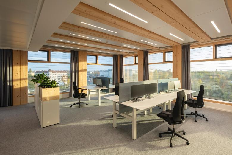 Unterstützt durch die Holz-Hybrid-Bauweise ist das Projekt DGNB-Platin vorzertifiziert und erhält Deutschlands erstes WELL Core & Shell Gold Zertifikat.