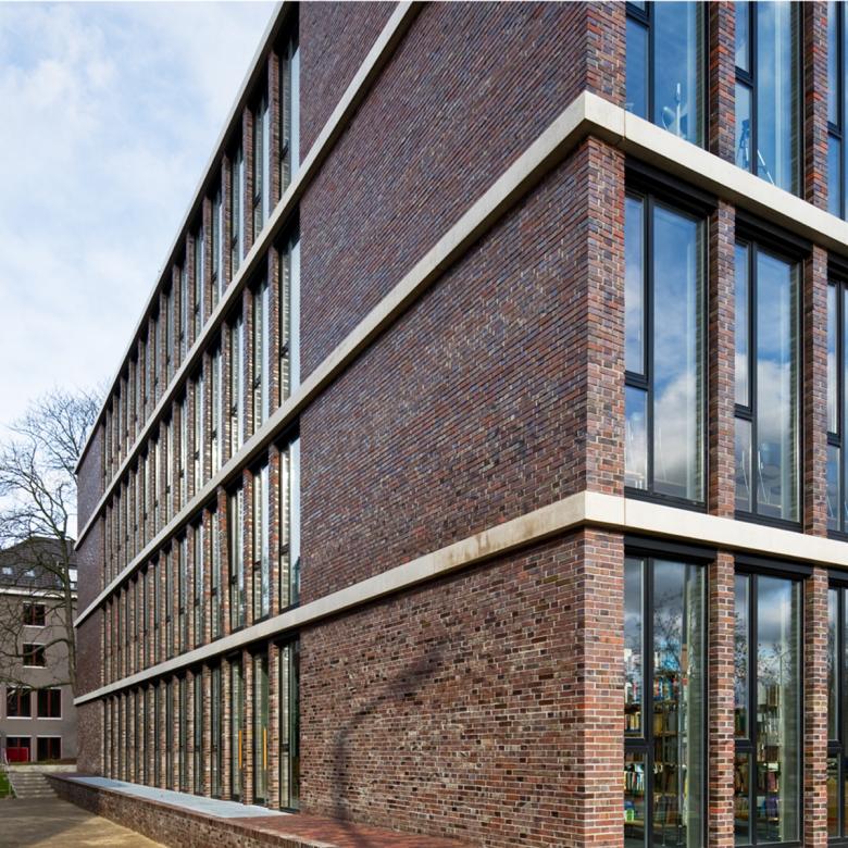 Der 4-geschossige Baukörper des neuen Schulgebäudes öffnet sich schaufensterartig zur Landgraf-Georg-Strasse. Zur angrenzenden Bebauung bildet sich ein campusartiger Platz. Die zentrale, alle Ebenen verbindende Innenhalle bildet das Herz der Schule. Mit ihren Galerien ist die Halle Treffpunkt für Schüler und Dozenten und Versammlungsstätte bei großen Veranstaltungen. Alle der Konzentration dienenden Räume sind ringförmig um die Halle angeordnet. Zwischen den Klassenräumen sind kleinere Gruppenräume angeordnet, so dass differenziertes Lernen in unterschiedlichsten Formen möglich ist. Das Fassadenmaterial nimmt Bezug zu den Altbauten des Elisabethenstifts und der Mathildenhöhe.
