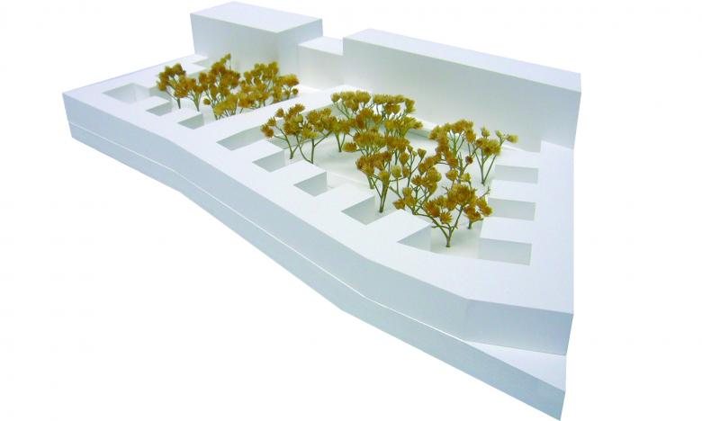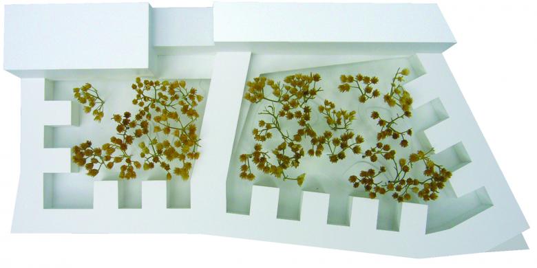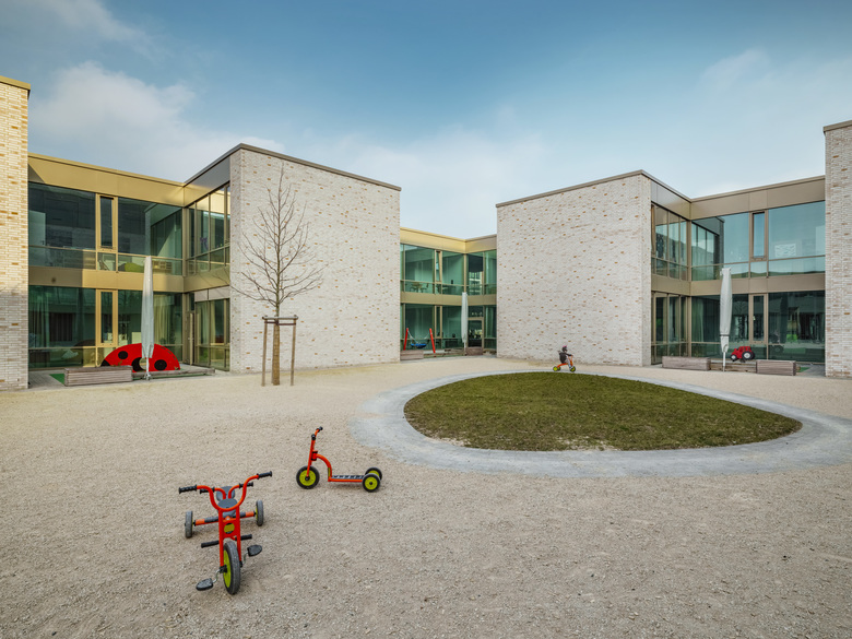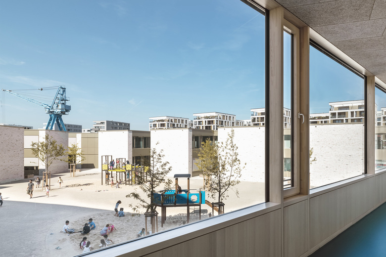 Wie ein Schutzgürtel umschließen Grundschule, Kindergarten und Sporthalle einen großen Hof, der als grüne Mitte das Herz der beiden Einrichtungen bildet und als Spiel- und Lernbereich genutzt wird. Der 5-geschossige Fachklassentrakt und die übereinander angeordneten Sporthallen bilden eine kraftvolle Raumkante zum Nordring. Zum Innenhof entsteht aus den wechselnden Nutzungsbereichen eine feingliedrige Struktur mit einzelnen, sehr gut ablesbaren Klassenhäusern. Die Räume der Krippe sind ebenerdig zum Innenhof im Erdgeschoss, die Räume des Kindergartens im 1. Obergeschoss angeordnet.