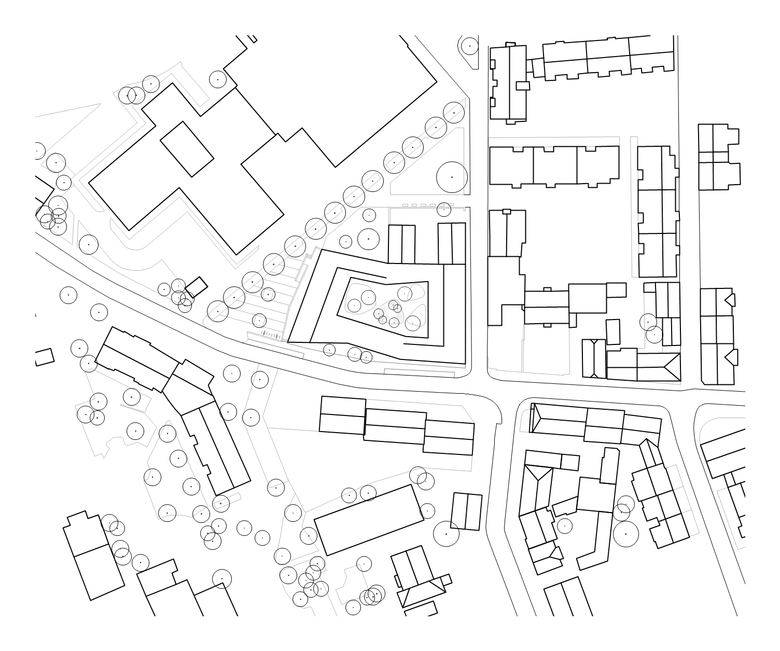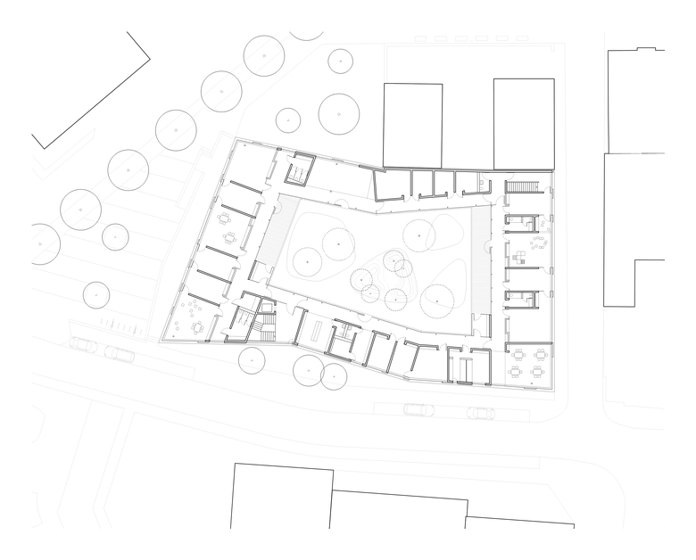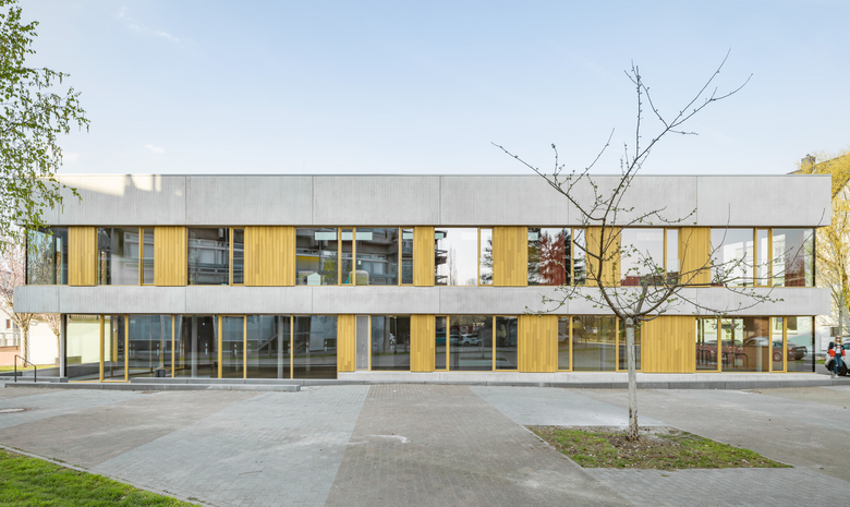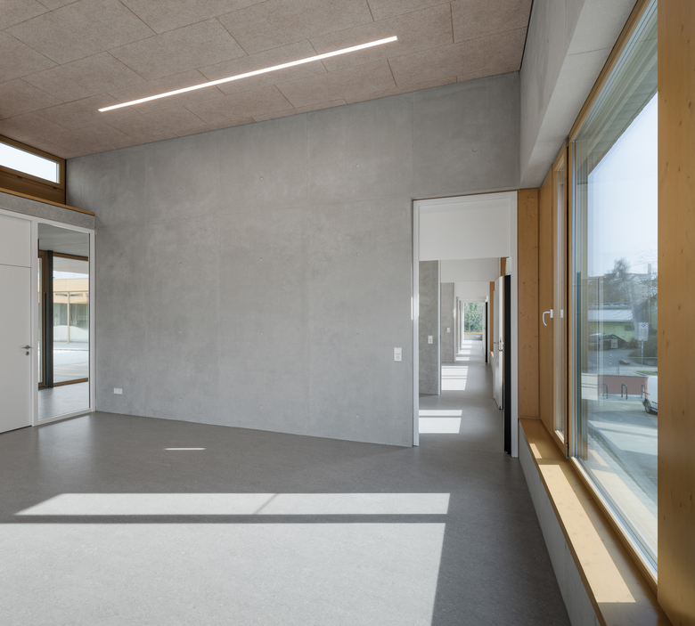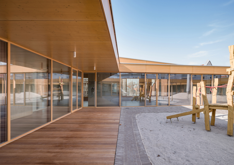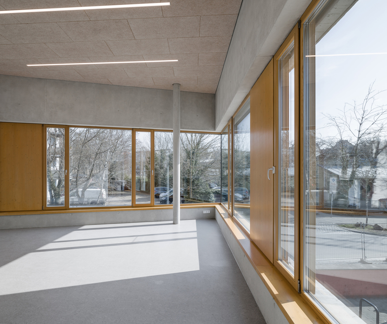 Mitten im Quartier ist das von allen Seiten gut erreichbare Grundstück für die Nutzung als Betreuungseinrichtung ideal gelegen. Der zweigeschossige Baukörper löst mit einer zunächst ungewöhnlichen Funktionsverteilung – Kindertagesstätte im Obergeschoss, Jugendzentrum und Schülerbetreuung im Erdgeschoss – die Anforderungen an Erschließung und Niedrigschwelligkeit. Durch die zurückhaltende Architektursprache fügt sich der Baukörper sehr gut in den heterogenen Kontext ein. Im Inneren wird eine bergende, heitere und freundliche Atmosphäre der Offenheit erzielt als Voraussetzung für entspanntes Heranwachsen und Lernen.