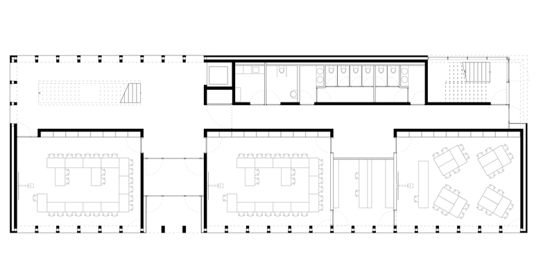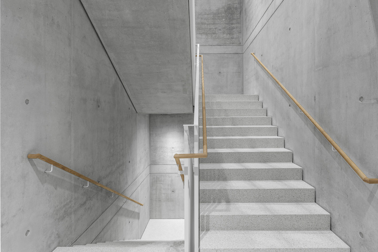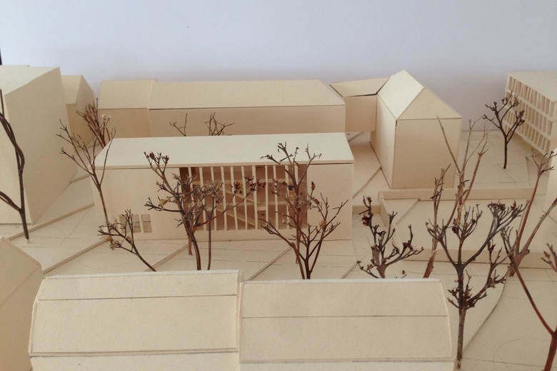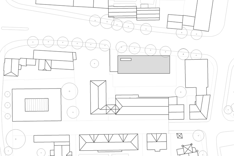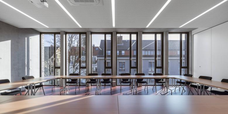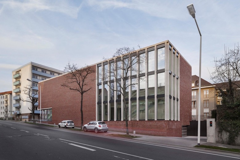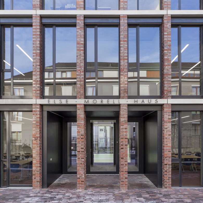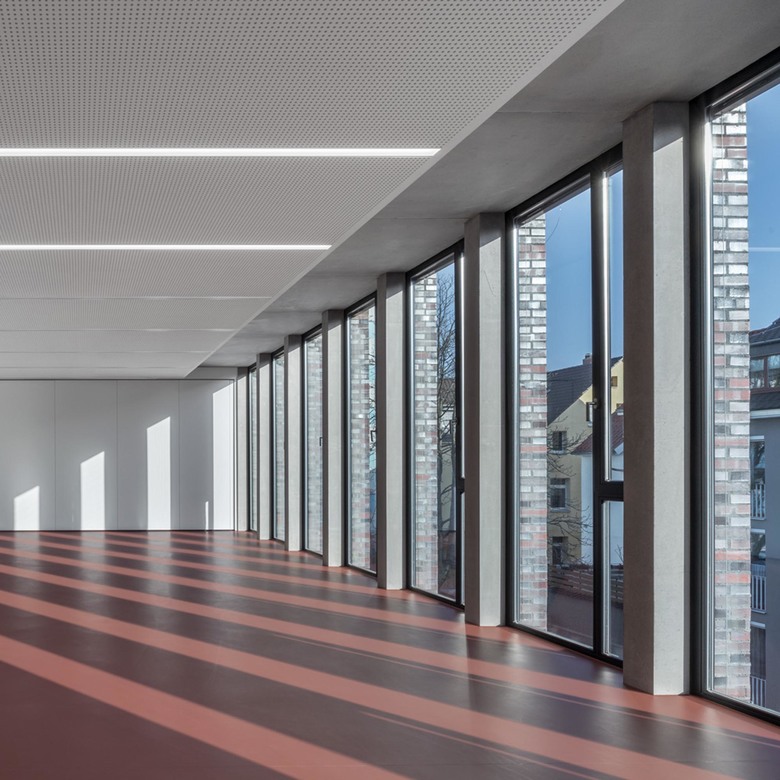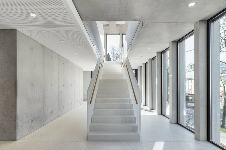 Der Neubau des dreigeschossigen Schul- und Weiterbildungsgebäudes nimmt als Riegel die nachbarlichen Baufluchten auf und schließt den Blockrand zur Pützerstraße. Durch die großzügige Geste einer mehrgeschossigen Glasfassade an der Südwestecke öffnet sich der Baukörper einladend zum Straßenraum. Mit seiner Ziegelfassade und den Fensterelementen in Holzbauweise erhält der Baukörper einen warmen und freundlichen Charakter und fügt sich so gut in das nachbarschaftliche Wohnumfeld ein.