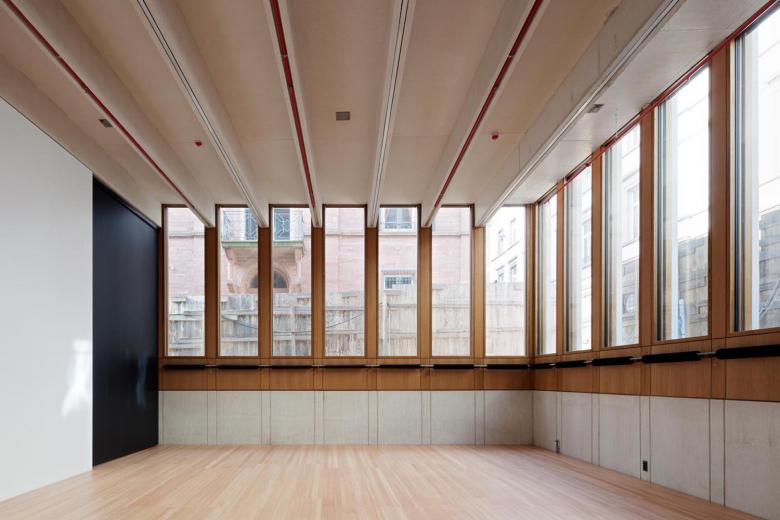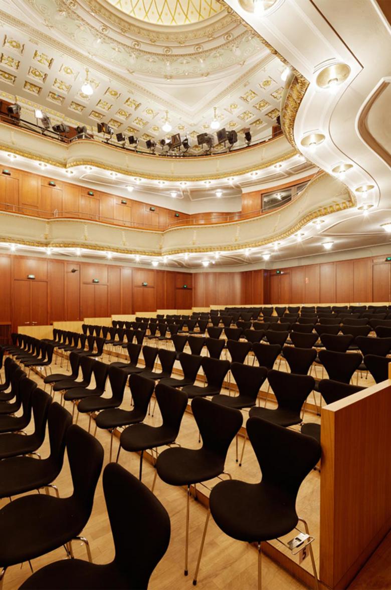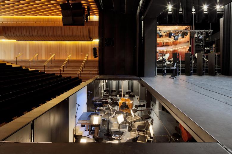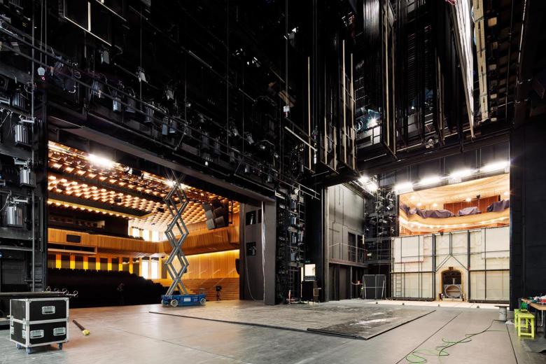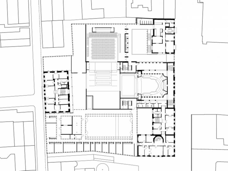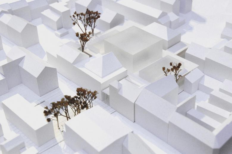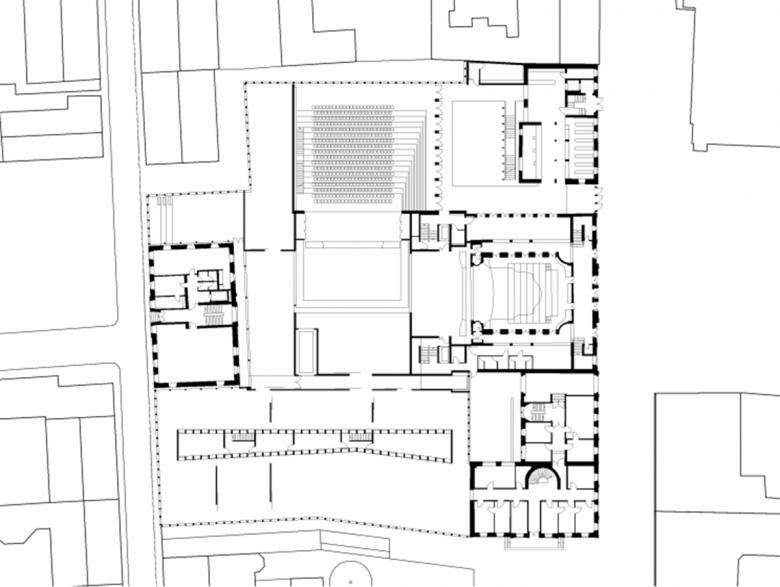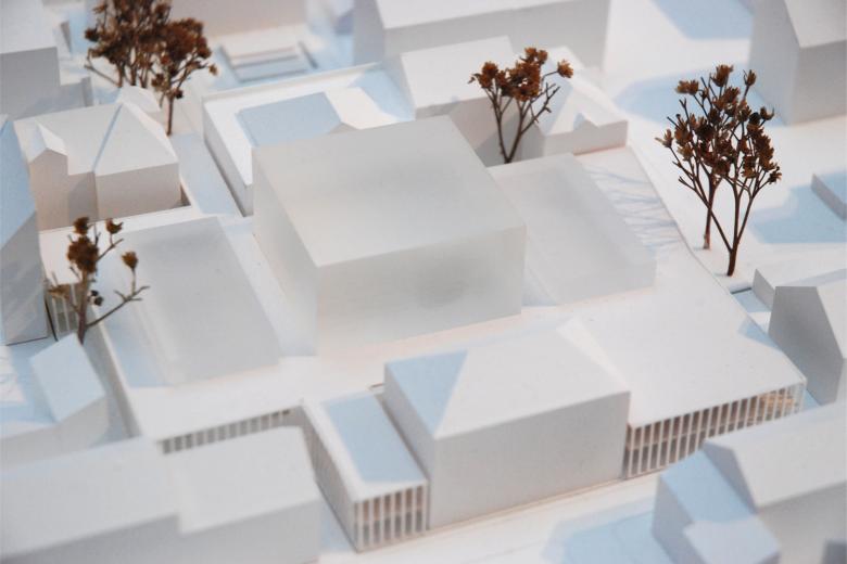Die große Kubatur der Theaterfunktionen verbirgt sich unter einer durchgehenden nur zweigeschossigen Dachplatte. Diese fährt allseitig die Grundstückskanten nach und verbindet so die heterogene Gebäudesubstanz des historischen Bestands. Die aufragenden Kuben der Proberäume und des Bühnenturms bilden maßstäbliche Hochpunkte und Gliederungen innerhalb der Dachlandschaft der Altstadt. Die senkrechte, feingliedrige Fassadenstruktur aus hell eingefärbten Sichtbeton-Fertigteilstützen nimmt vorhandene Proportionen auf und gibt den Altbauten ein zurückhaltendes, ruhiges Passepartout, so dass diese in ihrer Wirkung gesteigert werden. Aus der Kombination der alten und neuen Bühnenbereiche ergibt sich eine untypische Seitenerschließung des neuen Theatersaals, aus der ein neuartiges Raumkonzept mit vielfacher Bespielbarkeit entwickelt wird.