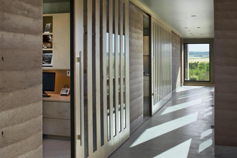 Taking cues from its flat open surrounds, the EarthWall 2 residence is as much a nod to its plane-like site as a product of it. An unabashed “ground-scraper,” the home’s sod-covered roofline enforces the horizontality of the site while deemphasizing the 6,000-square-foot volume. Composed of Ward + Blake Architect’s patented EarthWall post-tensioned steel rammed earth wall construction, the earthen walls literally rise from the soil that was used in their construction.