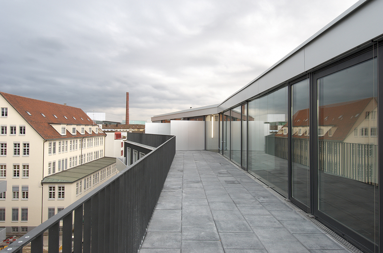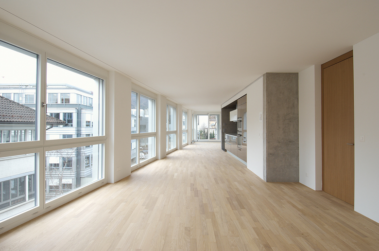 Sämtliche Wohnungen weisen mit je einer Hof- und einer Strassenseite eine zweiseitige Orientierung auf. Dies geschieht primär über den Wohn-/Essbereich. Die Nasszellen unterstützen in ihrer Anordnung und Ausbildung auch hier das Thema des «Durchwohnens»: Das Bad wird in die Zimmerschicht integriert, so dass eine zweite durchgängige Sichtverbindung entsteht. Dies erzeugt eine Grosszügigkeit und räumliche Vielfalt auch bei den kleineren Wohnungen. Die Badlandschaft sowie die Küchen werden als Nischen in den zentralen Nasszellenkörper eingeschnitten. Dieses räumliche Konzept wird mit zwei Ausbaulinien umgesetzt: die eine arbeitet mit der Struktur und Oberfläche von Materialien, die andere mit dem Thema Farbe und Beschichtung.