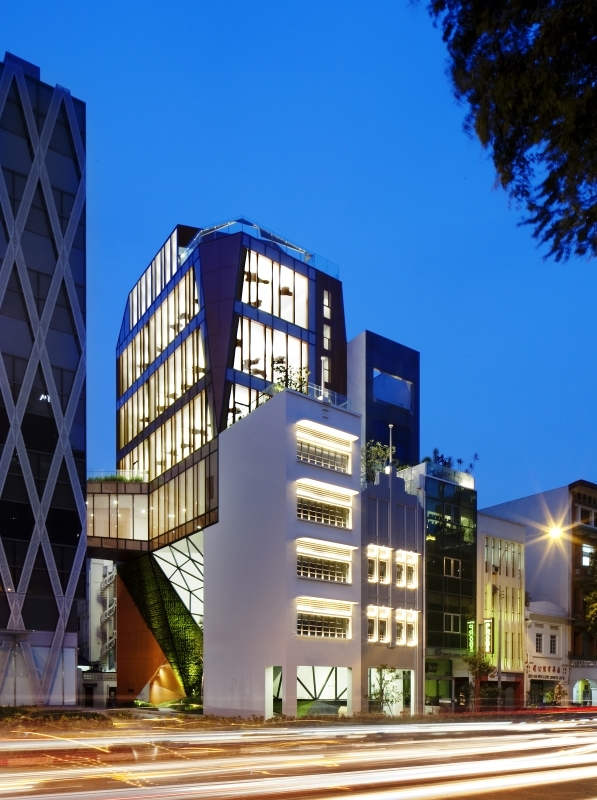 The project brief called for a new boutique office and the reconstruction of a pair of heritage-listed shophouses.