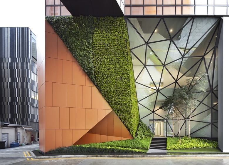 As the original floor levels with their low ceiling heights were retained, the front end of the shophouses was deemed more suitable for meeting rooms, while the service end accommodated a mechanised carpark. The open plan offices within the upper 4 floors was strategically lifted up so that floor plate size is maximised, higher headroom is gained, better views are enjoyed and more natural daylight is accessed from the sides. Every flat roof area is also transformed into roof gardens with the attic featuring the office’s recreational lounge.