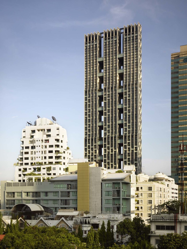 The design is inspired by Thai forms – ceramic tiles, textiles and timber paneling, abstracted and used as a way to organize forms. The cladding, for instance, uses temple tiles as an inspiration, while the staggered arrangement of the balconies recalls the Thai teak staggered paneling on traditional houses. The walls incorporate random inserts of faceted polished stainless steel, a contemporary interpretation of the sparkling mirrors incorporated into Thai temples, returning this delightful glittering effect at a scale appropriate to the vast central city.