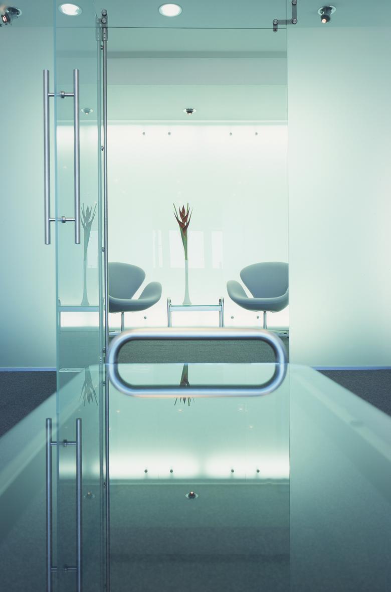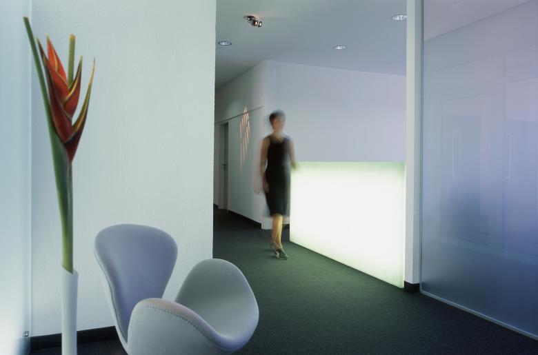 The appearance of this law firm was integrated into the existing very reduced corporate design, which we liberated from its official stuffiness giving it a timeless but simultaneously modern character. Soft grey as state-of-the-art corresponds with the “no colour” concept. Pure white, anthracite and last but not least shimmering, translucent glass are the ingredients. The only decoration is illuminated patterns projected onto the hall walls. The glass ceramic reception counter seems to be a giant ice cube from a distance. Up close the surface looks like crushed ice.