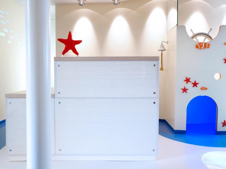 The children’s dental practice is about a blue lagoon island-underwater world, which reduces anxieties of the little patients and also optimizes working process for the staff and physicians.