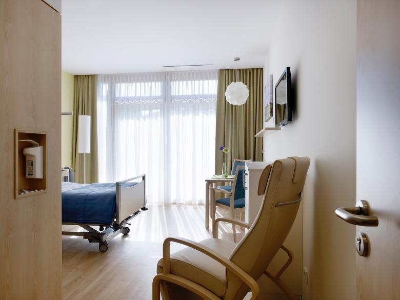 After our experience in the health sector the new hospice building in 2011 was something like the ultimate. The sponsors wanted a hospice that offers dying people a place of kindness where they can spend the last part of their lives in dignity and a feeling of security. A place where they can feel comfortable, which allows proximity to other people in a homely atmosphere but provides privacy too. A carefully selected colour concept, pleasant materials and shapes ensure a life affirming, positive atmosphere, where residents, their relatives and staff feel comfortable.