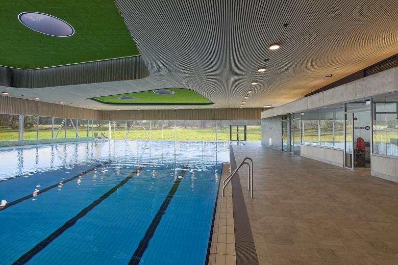 In the center of the building, between the leisure and sports areas, is the wellness zone with steam baths, showers and relaxation areas. Glazed walls between the different zones provide good orientation and maintain the spacious feeling of the bathing hall. Inside, friendly, natural and robust materials that are durable and easy to clean lend the new indoor pool a feel-good atmosphere.