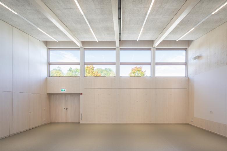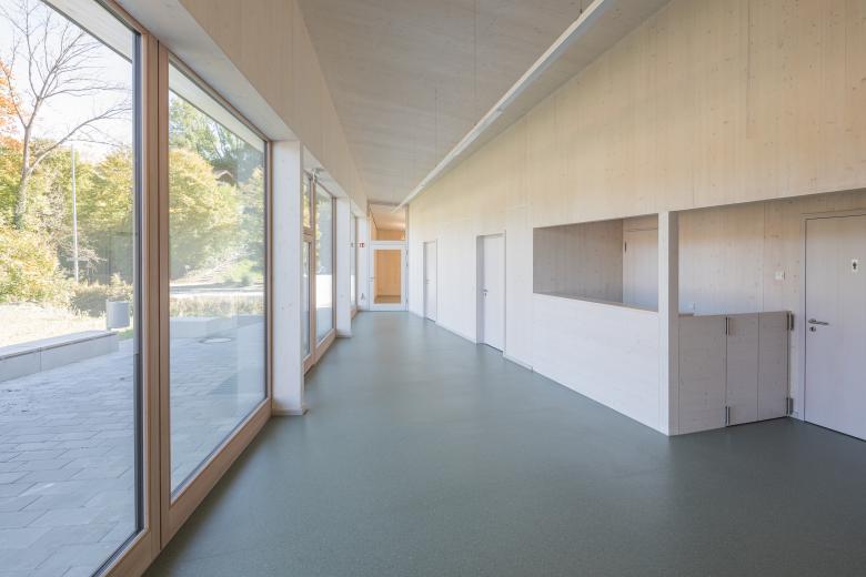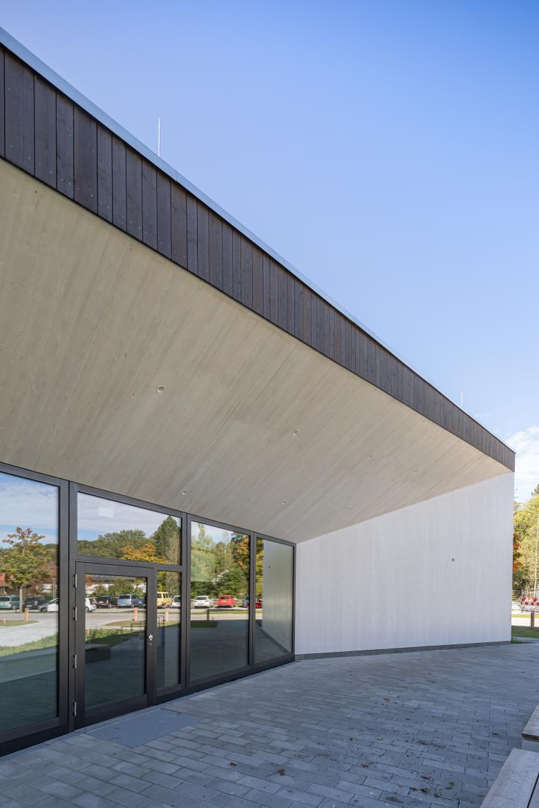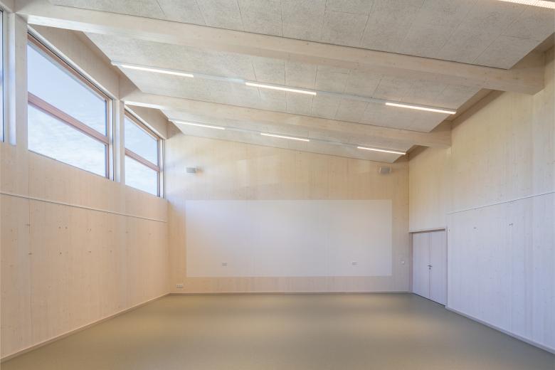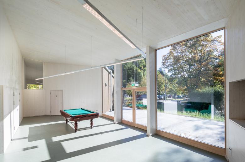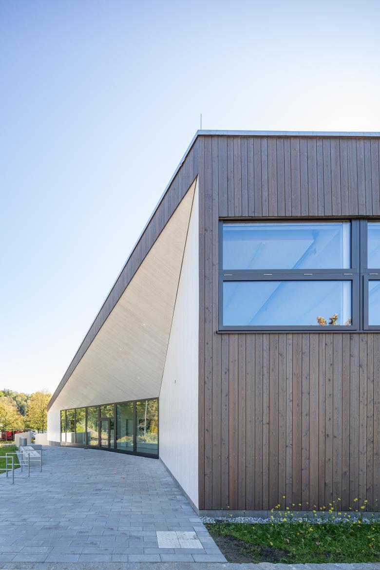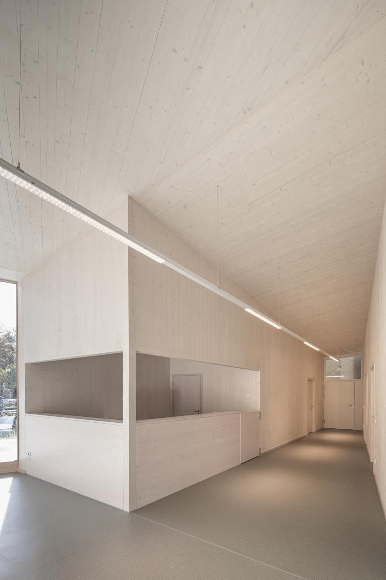 Die komplexe Erscheinung birgt ein einfaches Konstruktionsprinzip mit einem einseitig geneigten Pultdach und nutzt die unterschiedlichen Anforderungen an die Raumhöhen. Wand- und Dachkonstruktion bestehen aus einer robusten Brettsperrholzkonstruktion.